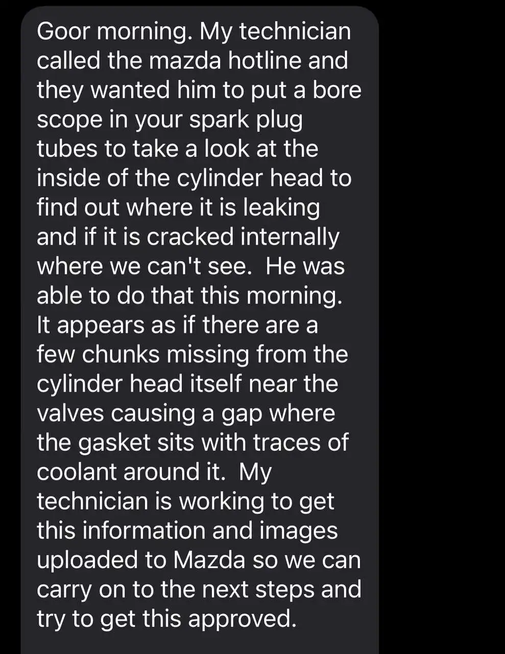 After back and forth with Mazda, gathering information to enlighten me about the coolant leak, I was able to compile enough supporting evidence with regard to the manufacturing defect. Don't get me wrong, I love my car and that is why I purchased it but....I had no clue of the defect issues until now. I did have to educate myself in order to defend my rights so I joined groups and found this site to see what others were saying. I have been disputing this issue with Mazda Corp since 3-18-23 because they would not accept liability and it was a back and forth thing.