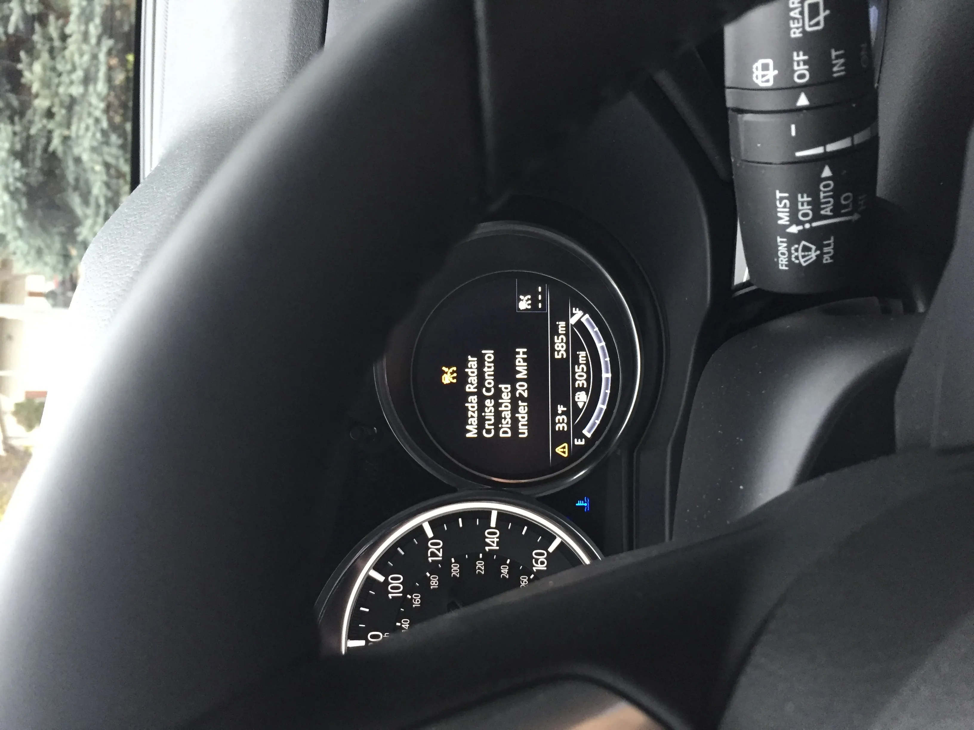 I have a brand new 2017 CX-5 Grand Touring with stop and go cruise control. About 50% of the time I use the cruise control, I get this message: "Mazda Radar Cruise Control Disabled under 20 mph". The radar faceplate and the camera are both clean (I get a different message when they are obstructed). The dealership has checked the computer and found no errors or faults. There doesn't seem to be a pattern as to when it's disabled and when it's not, so I'm having trouble diagnosing.
