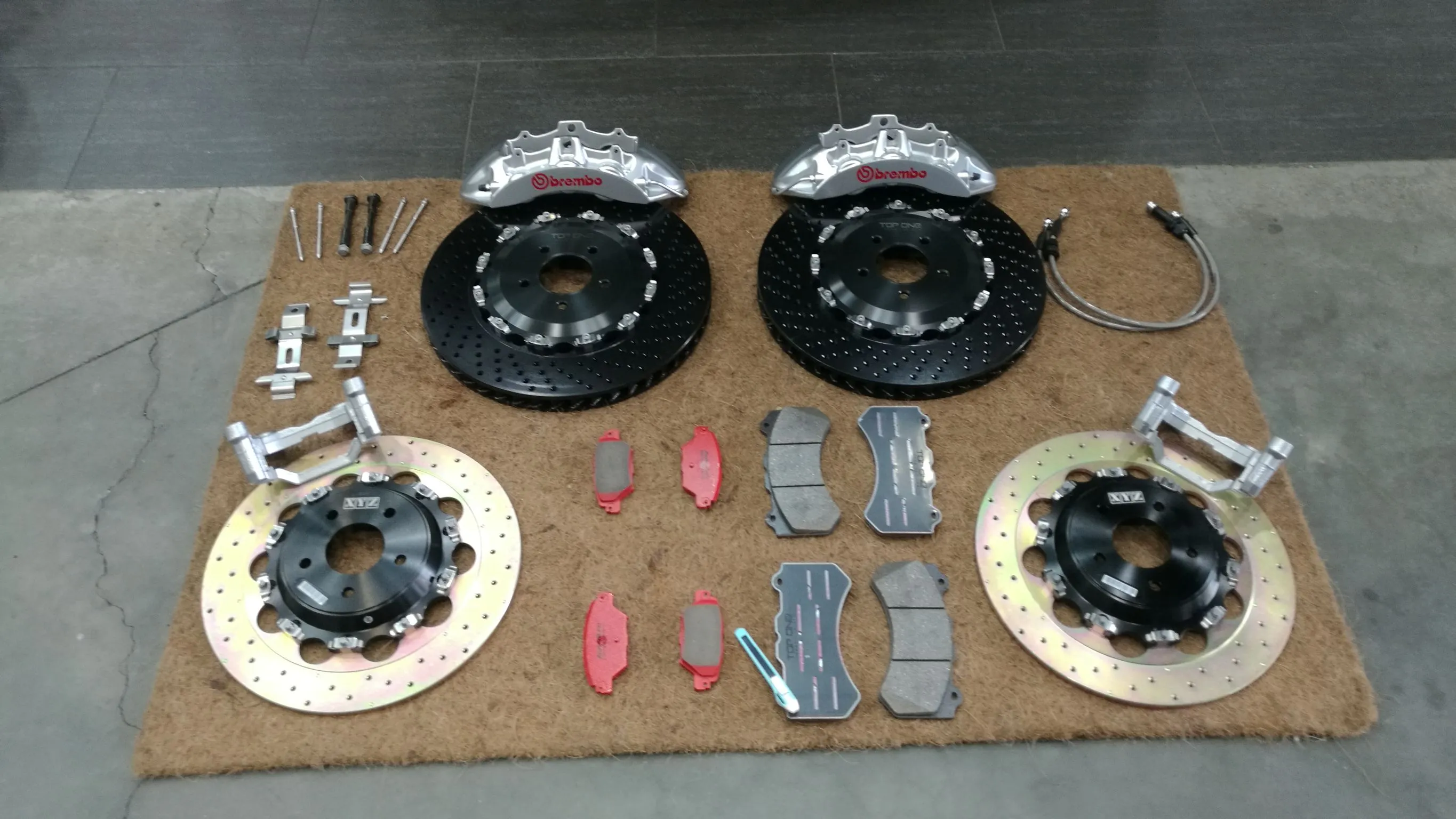 Not sure on brand of rotors, but they look legit (albeit way too aggressive for street use, probably). Calipers are not Brembo - if you look closely you'll see that they are just Brembo caliper covers.