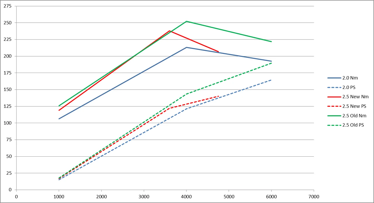 For the US market you can see the low torque is very similar (as you'd expect for the same 2.5l) but the high torque has disappeared! As this will have to be geared like the EU version, the US market will see a drastic decrease in performance.