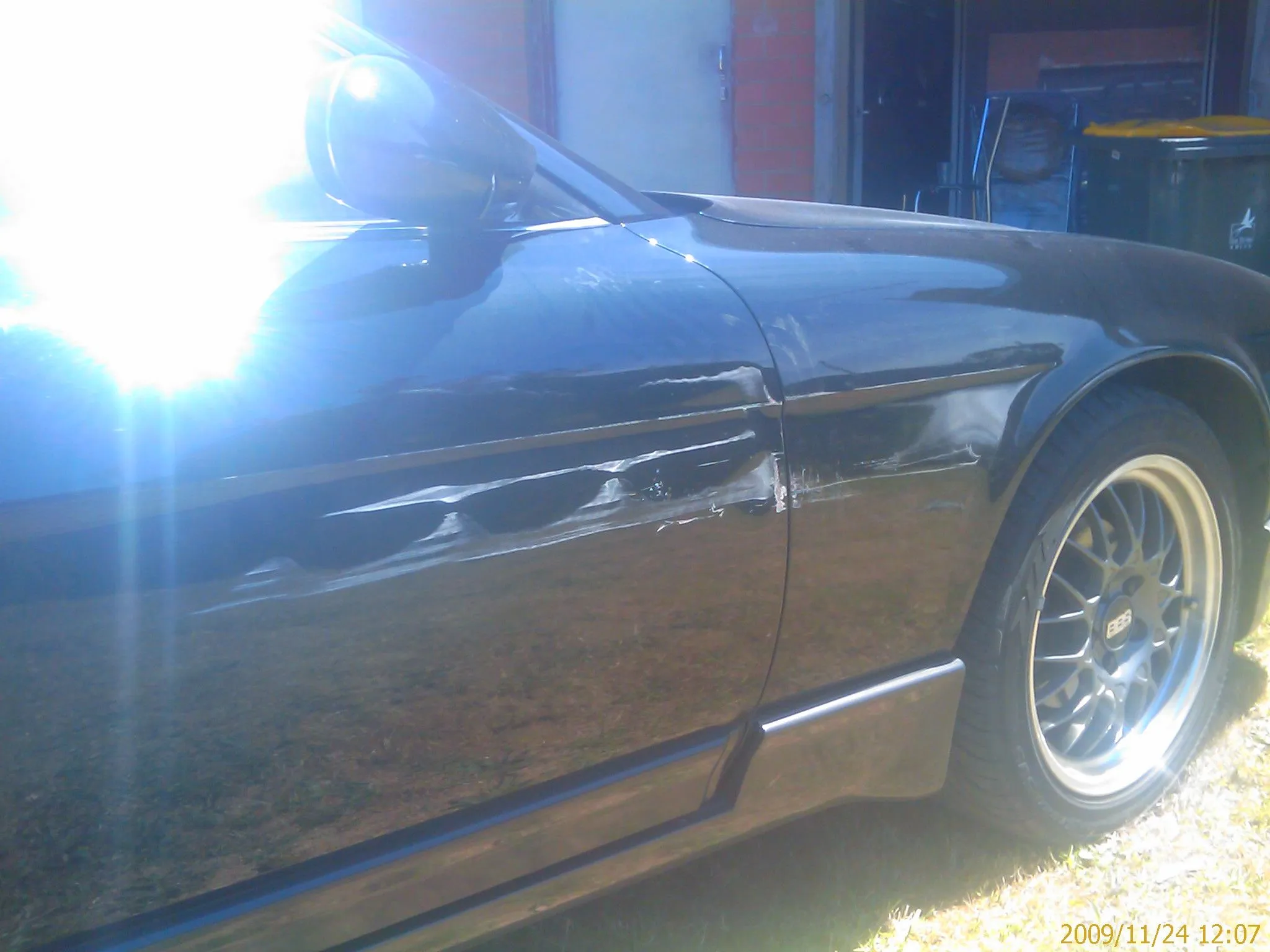 it broke the driver side mirror. and some scrapes. just barely dented. i'm glad it just missed the wheel well as that would have been hard to make look rite again.