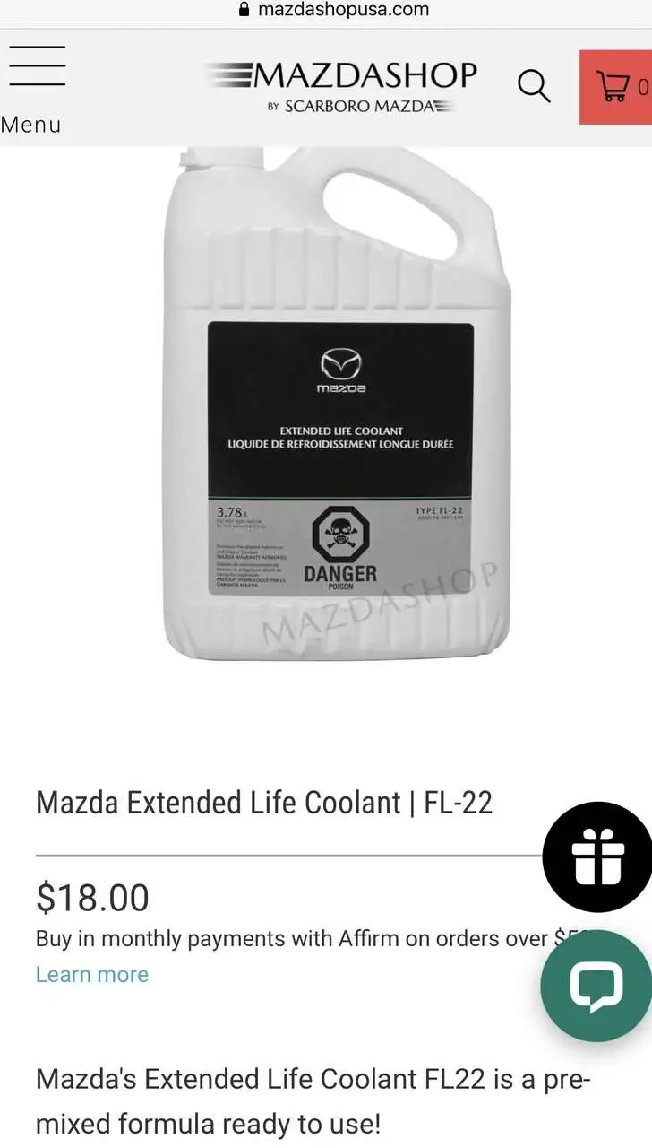 Hi. I noticed my coolant is below the L line and would like to top it off. I understand that there might be a leak, something I will be monitoring afterwards. I would like to use Mazda’s FL22 premixed coolant, but having trouble finding correct part number. I found three:
