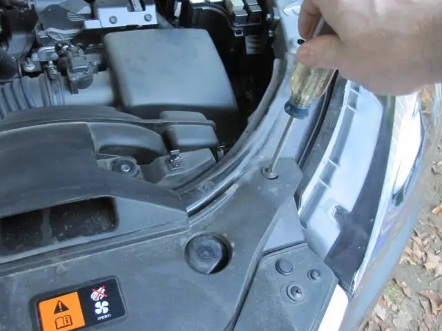 Begin by removing the two push pins to take off this panel. Be sure to pop up the center pin first with a screwdriver or you will damage the pins. You will need them for reassembly. Once the pins are removed, slide the panel towards the front of the car to remove it.