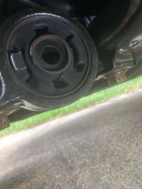 Here's pix of my LCA bushings (big rear bushing) at ~ 60,000 miles. New LCA's were installed shortly after these pictures taken. In the 2nd pic, left side control arm, one of the 'spokes' is torn completely through horizontally @ 7 0'clock position. When jacked up with the wheels hanging down, the upper and lower halves of that 'spoke ' shift opposite directions sideways indicating a clean break and not a surface crack. Also tears at ~ 10 o'clock and small tear at ~ 2o'clock. Notice 'spoke' at ~ 5 o'clock position tearing away from metal center bushing.
