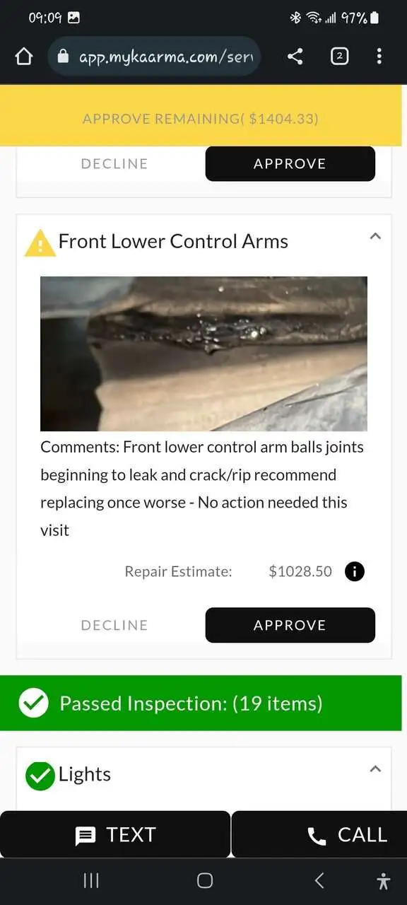 -front lower control arms (Front lower control arm balls joints beginning to leak and crack/rip recommend replacing once worse - No action needed this visit). $1028. Inc tax.