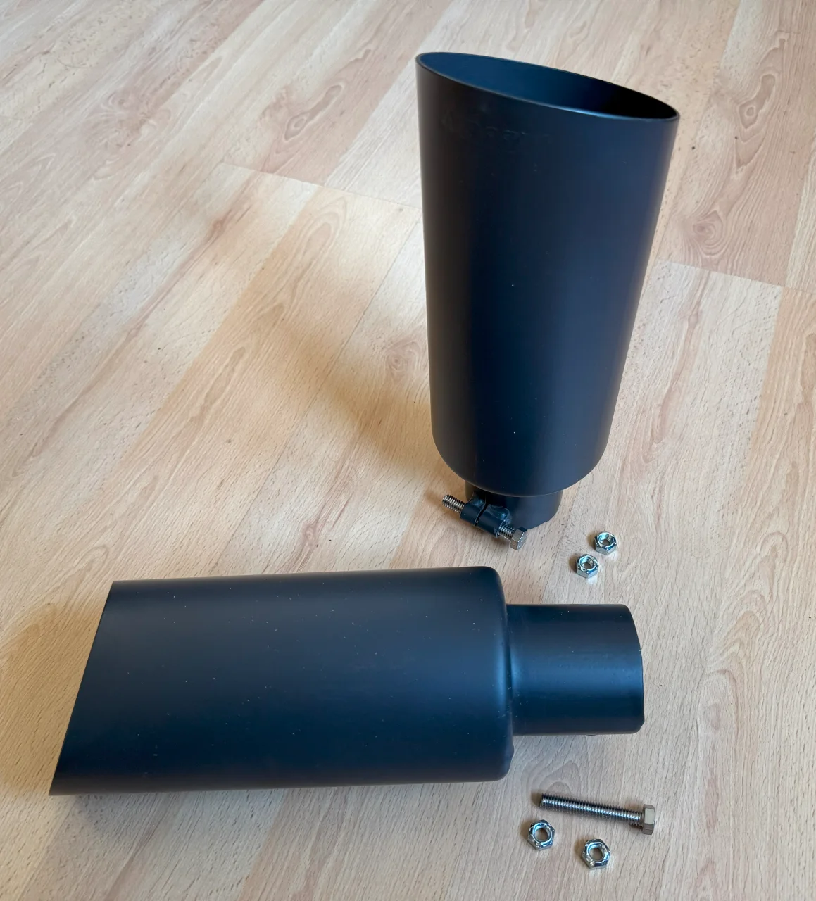 The outer diameter of the CX-9's exhaust tubes (behind the short stock tips) is 54mm. That is extremely rare, and there are no exhaust tips available specific to this size. The "universal inlet diameter tips" with three bolts weren't an option, because they don't mount reliably (I've had two fall off from others cars long ago). They are also effectively open on both ends, and I don't like see-through exhaust pipes.