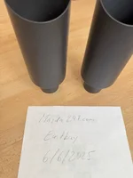 They are matte black ceramic coated stainless steel and made in USA. The black coating completely eliminates the ugly soot stains that ruin the look of bright exhaust tips. These tips fit perfectly in the recesses in the CX-9's rear skirt, with an even and sufficient clearance of 0.6 inches all around. With the angled edge, they perfectly follow the contours of the bumper. The tips are long enough that when seen from the side, they maintain the 4" diameter all the way until they disappear from view behind the skirt. And they are so long and dark inside that the thin original exhaust pipe is not visible from behind the car, not even when you're looking into them from the low seating position in a Miata. We checked that