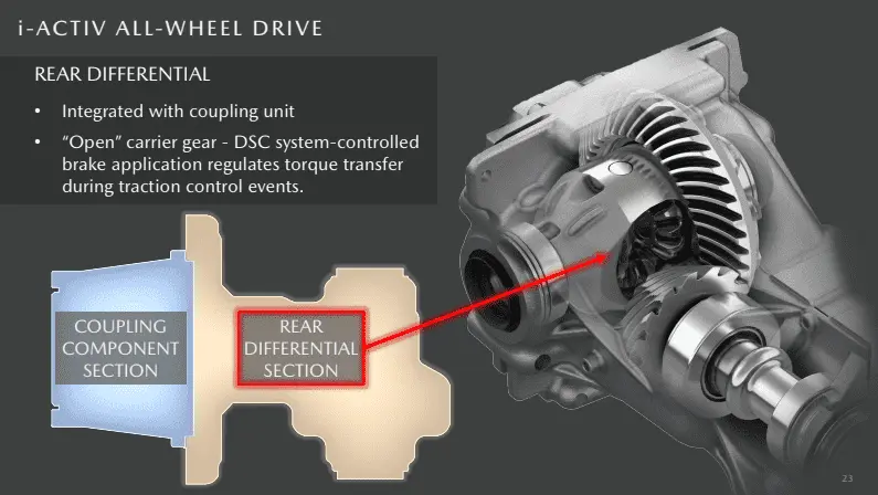 I would like to know where power flows 'first,' how the front and rear axles are tied together (e.g. via a viscous coupler to the rear (or to the front)), whether the differentials are mechanical differentials or if they use clutch packs to 'engage' each half-shaft (a-la Honda's pickup and Pilot, in the rear), and so forth.