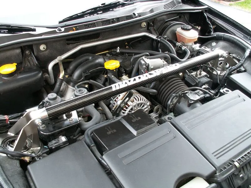 Now, these are photos from different model years, but the main difference is visible. Both bars bolt to the upper strut via 3 bolts on each side, but the Megan bar has 2 additional bolts that can be used to tighten or remove the bar from the end braces that bolt to the upper strut. That makes it a multipiece bar. The Ultra Racing bar doesn't have these 2 additional bolts - instead the bar and the end braces are all welded together.
