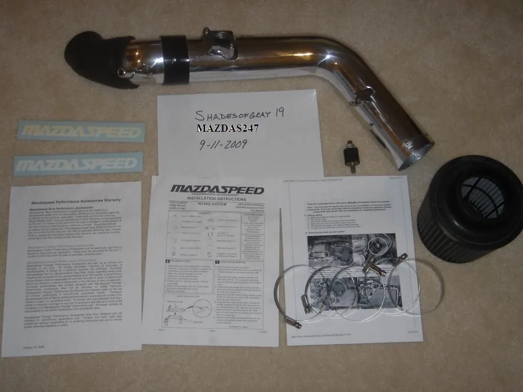 I am selling a Mazdaspeed CAI for a Mazdaspeed6. I would like to get $150 shipped any where lower 48 US states. This will not fit a regular 6. This intake performed flawlessly for me while I had it installed, probably about 15k miles. I never got questioned by the dealer when I went in for warranty work with it installed. What you see in the pictures is what you get. I just cleaned the filter and it is ready to go. There are some minor scratches and normal wear and tear on the piping. Only thing missing from the original kit is a zip tie to attach the MAF wire to the intake and the cleaning solution which I have used. I am including factory instructions and warranty paper work, a how to on installing an AEM CAI which is identical to the Mazdaspeed one, and Mazdaspeed stickers. PM me if you are interested and for paypal info.