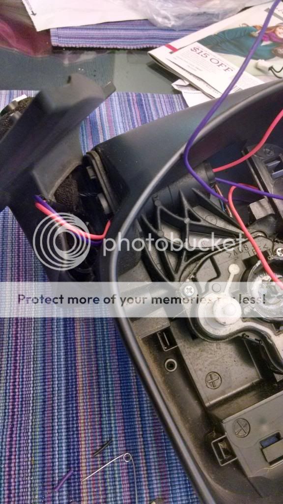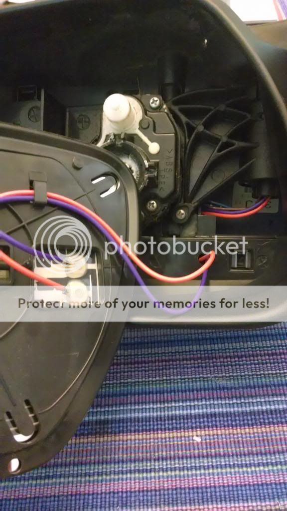 Step 4: Wiring it up. Rather than try to remove the wire from the pins and likely destroy them. I extended the pin wiring by soldering them and insulating the connections. Once the wires are fed through, this connection will be in a tube within the mirror and will not be exposed or even visible. Now fish the wires from the plug to the inside of the mirror housing. Just follow the route of the factory wiring and even up the lengths so it can easily be tucked back into the housing. The factory wiring is encased in foam but its easiest to just stay outside of it and not tamper with it. Once they are fished through you can reassemble the mirror. Now that its back together lets go to the final connection, the glass. The factory included small spade connectors so you could easily change the glass if damaged. I dont really see this as necessary plus I havent a clue where you would get these connectors easily. I figure if the mirror is ever busted, it would most likely require a full replacement and that solves that issue! lol There was a small existing hole that helps route the wires away from the motor and give room for slack behind it as well. I put about 2" behind the motor through that hole and made a loop through the molded in clip on the mirror frame to keep them out of the mechanism. At this point, I simply soldered the wires directly to the element without connectors. Be careful not to overheat this when you solder it. You must tin the mirror tab first, then the wire. Then you can easily join the two. I imagine its heat resistant to a good degree but still......You can also put some heat shrink on this connection if you are worried about corrosion.
