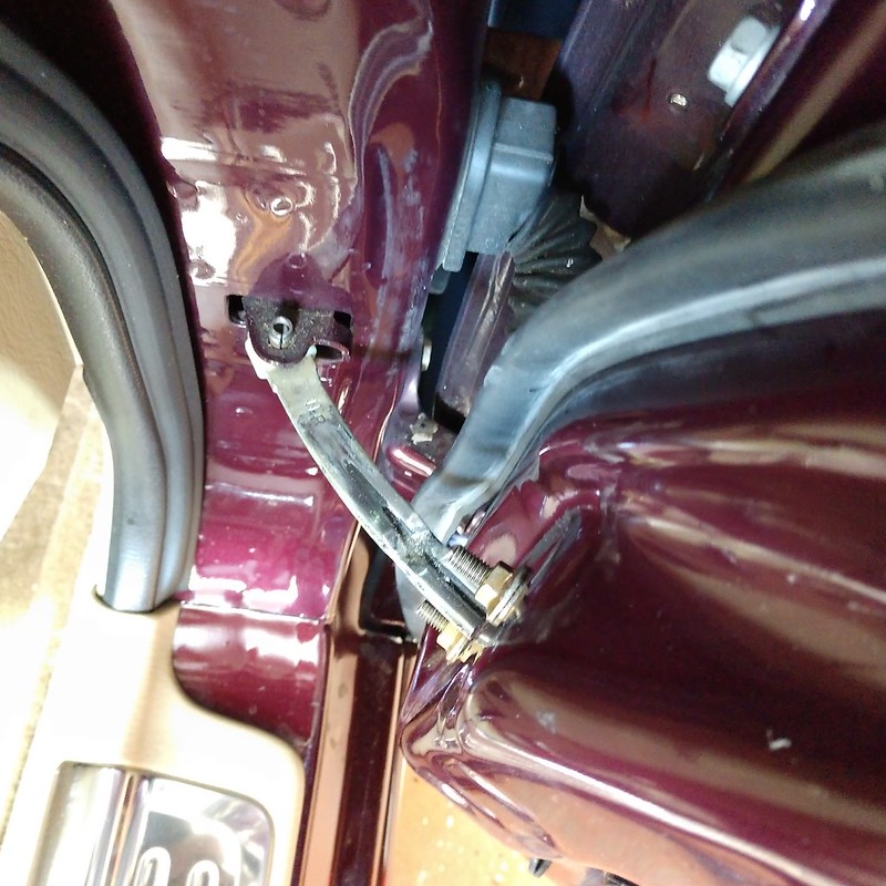 My schedule was slack today so I dove into the job. The first thing I did was adjust the window position and top weatherstripping using the factory manual to be sure everything was where it should be. I ended up lowering the forward window stopper on both sides, the other measurements were within spec. I also made some minor adjustments to the top strips on both sides so they would line up better. I should note I did the work on the driver’s side first then the passenger side (which is where I took all the pictures). First step is to remove the door interior panel. On the driver’s side I discovered one of the wires to my tweeter had broken and was intermittently making/breaking contact. This was probably the cause of my occasionally losing the left channel, so glad I found that. Once the door panel is off you need to peel back the vapor barrier at least in the front half. Next you want to remove the lower bolt holding the vertical piece for the vent window. Then go to the top of the window and remove the screw in that piece that is visible in the middle of the weatherstrip. The factory manual talks about removing the vertical piece but I just left it in place and loose. I then pulled out the part of the weatherstrip that goes down into the door on the vertical piece. Once that’s out continue peeling it back and then remove the second screw at the top of the vertical piece. Note that those two screws are different sizes. The larger diameter, shorter length screw is the one underneath the weatherstrip and will be in the hole towards the front of the door. See pictures below:
