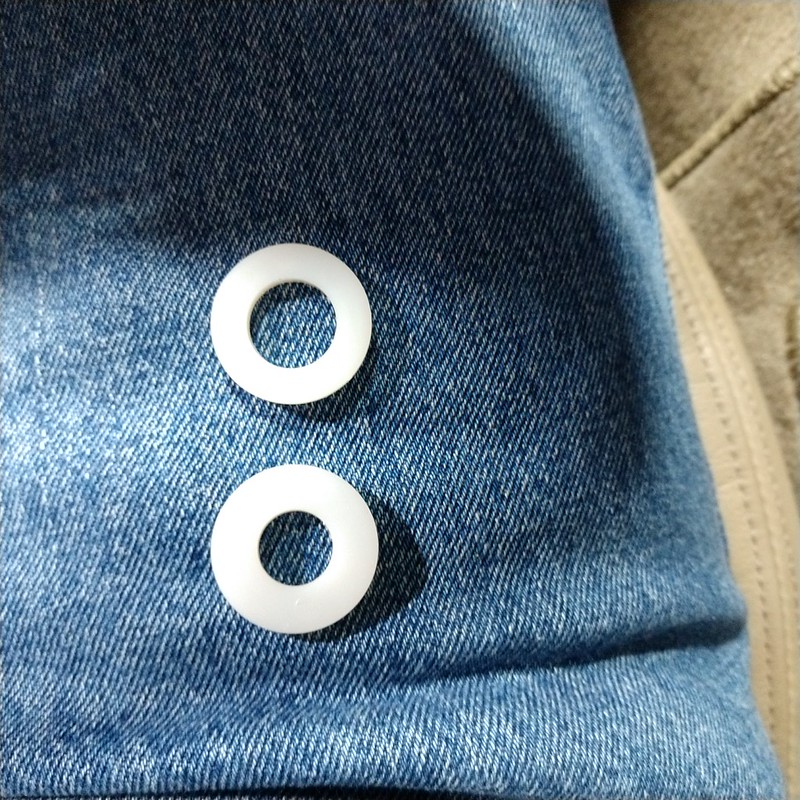 So, after all was said and done with the new shift knob installation, there was about a ¼” gap between the bottom of the knob and the boot. I couldn’t recall how much there was with the original knob, but I got to thinking about how one of the stock shift boots from one of my Mazdas had a plastic cup-shaped piece on the bottom of the boot that sort of took up a gap and kept the top of the boot in shape. That piece came off one time when I was moving stuff around and I never got around to replacing it. Since my brain was working I decided to get some nylon washers from Ace and use them as a spacer/shape holder for the boot. I measured the shift lever and top of the boot and came up with 13mm and 29mm diameters. Went up to Ace today and picked up the washers. Ones I ended up with were 25.4mm OD (1”) and 11.4mm ID (0.45”)/14.3mm ID (0.56”). All were around 1/8” thick. Here they are side by side: