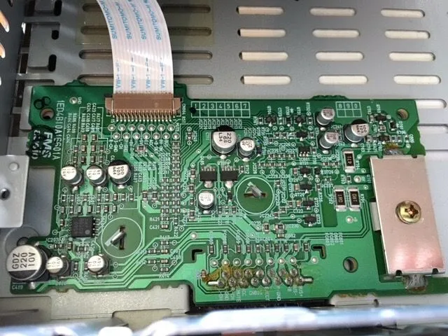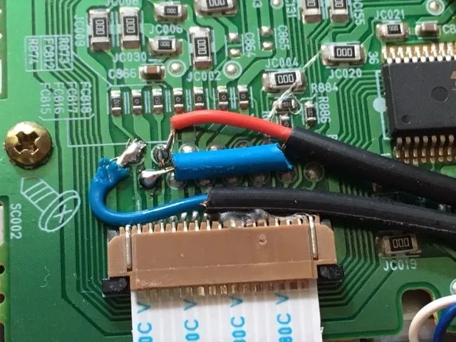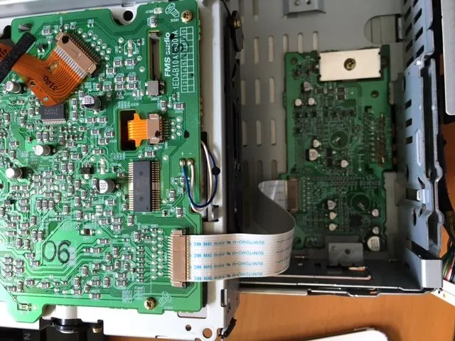 - I soldered to the top board (the one which is attached to underside of the CD player) and found this much easier than the lower board, as it's more accessible. Even though the lower board is the one which is labelled, the connections do of course make it through that ribbon cable in a straight line, so you can see easily enough where they appear on the top board.