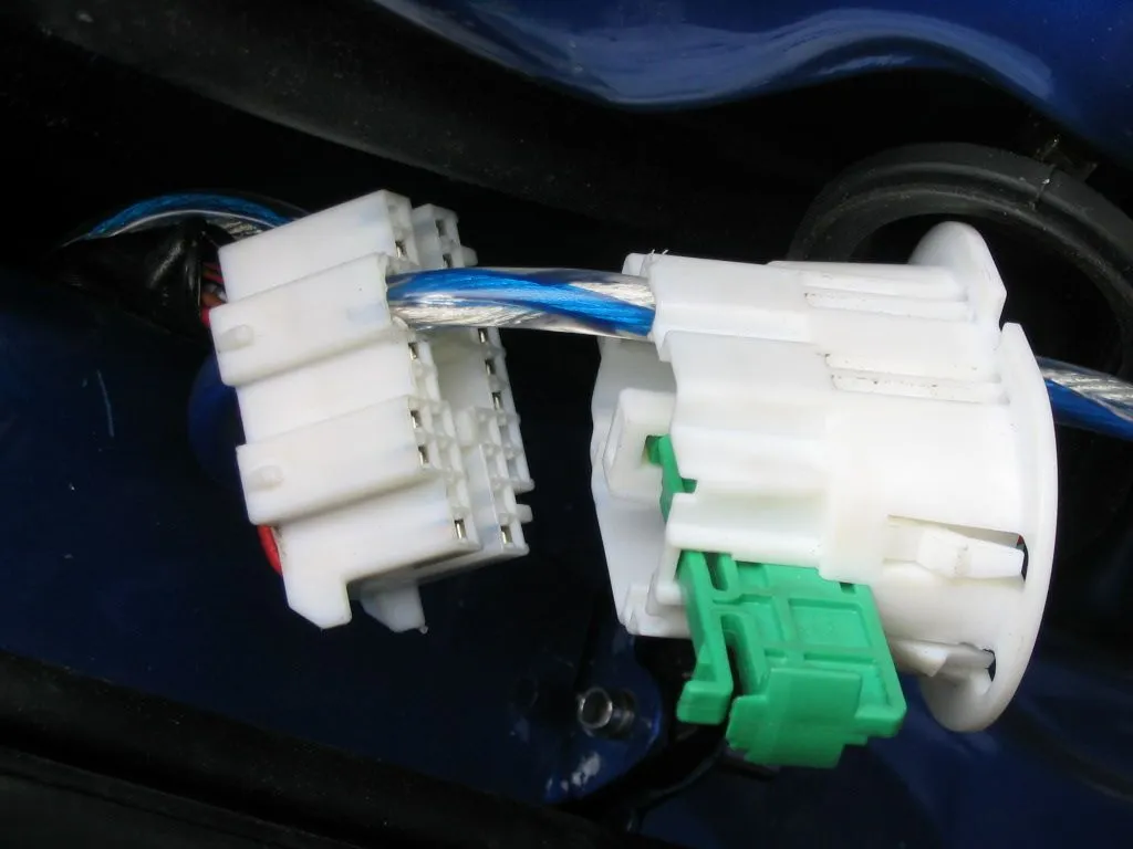 Just wanted to say that this thread was a great help today. I pulled apart both doors and installed my Eclipse components. If anyone is wondering, it is possible to run 16ga twisted pair cable through the wiring harness (see picture). Basically you need to drill out four empty slots. On the passenger side there is an un-used wire (no idea why) on the male end that has know female counterpart (poor guy). I traced it back to an empty molex connector that may have been used for a door lock switch at one time. I just moved the male end over one slot so I could get four in a square pattern to drill out.