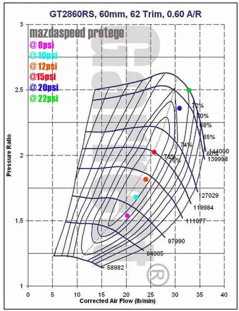 using estimate numbers this is what i got for the Garrett GT2860RS aka Disco Potato....