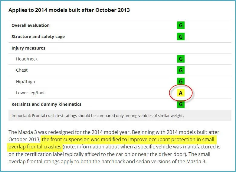 I just bought a 2014 Mazda 3 hackback about 2 weeks and it was made on 9/2013. I did not see the statement regarding "Models built after October 2013". It specifically states that the front suspension was modified to improve occupant protection in small overlap frontal crashes. Notices that the car got "A" for acceptable and not good rating for Lower leg/foot. I used to work for Ford and its not too uncommon to make running changes. Mazda has to have done something and would be nice to know what.