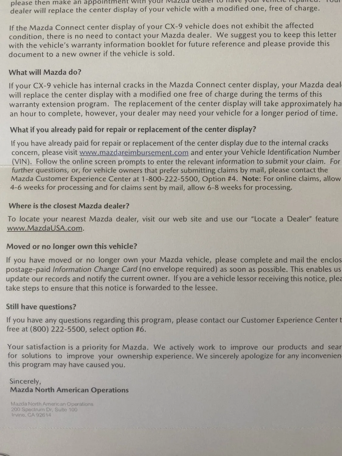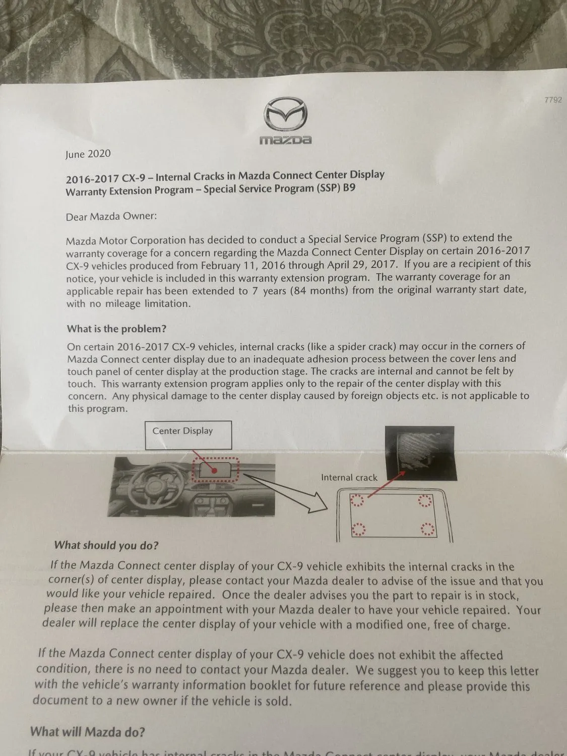 It's a known issue, lots of cases on CX-5s and 3s. Screen seems to be delaminating from the inside and externally it's smooth ie. no damage to the surface. In my case, it happened after temperatures fluctuated from warm to cold to warm. I suspect we don't see a lot of CX-9s yet because of their lower volumes or mileage than the smaller models. The TSB I uploaded was updated in 2018, so I my hunch / hope is they issued a PCA by then. Dealer also confirmed that p/n was different