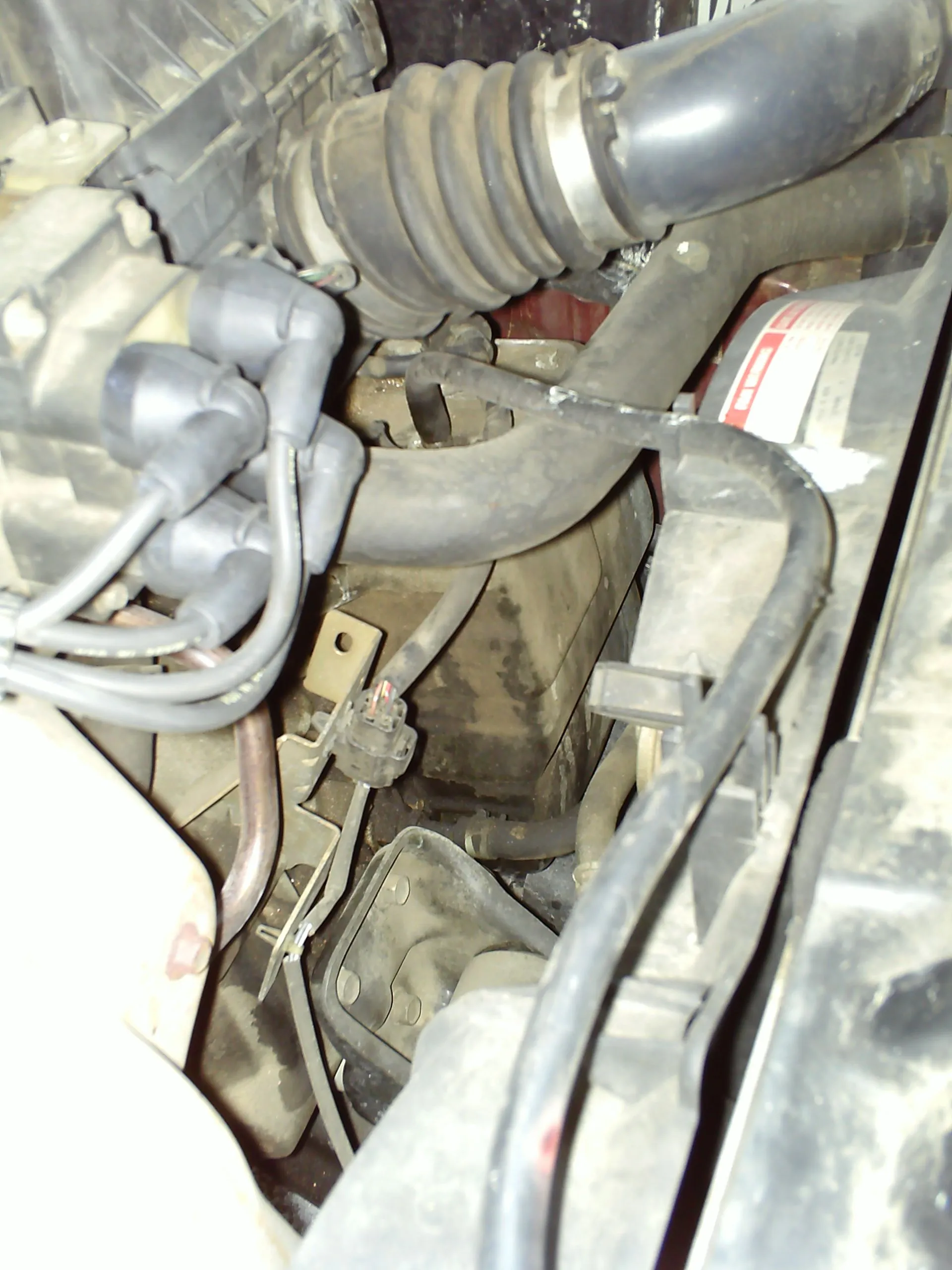 I'm trying to find out about a loose hose, looks like a vacuum hose that is attached to top of tranny, but other end loose. Is it supposed to be loose or should it attach something. I've looked pretty well and have seen no connector and the Haynes manual provides no help. Attached two pics. The first shows the hose laying across the radiator fan housing, it's connected to the transmission (??). The second pic shows it connection, hard to see but held on with a hose clamp. Any ideas?? My engine is running rough and I've already changed plugs, plug wires, cleaned mass air flow sensor. Did have a OBDII code PO171, but does not always stay on, on and off random. Thanks for looking !!!