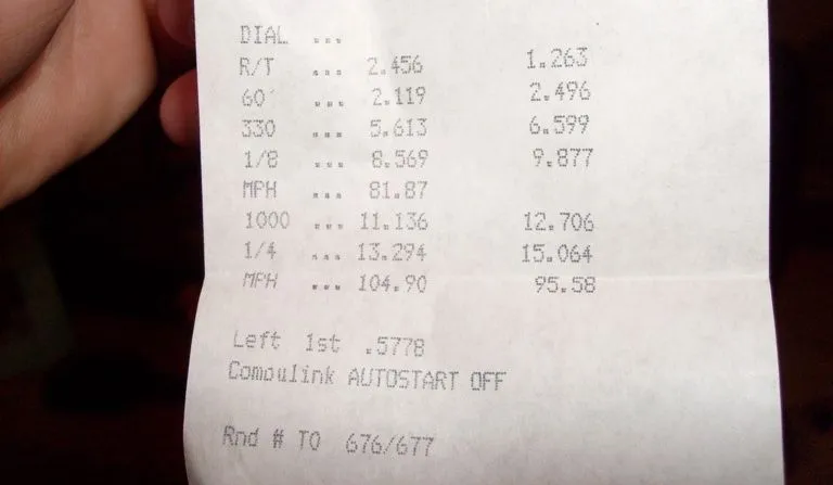 It is very interesting to me that you reached 105 mph and only ran a 13.294. You are more than .3 under my best 1/8 ET and about 2 mph slower. It interests me to think I could find a speed greater than 105 mph on the 1/4. I can only wonder......(RTM)