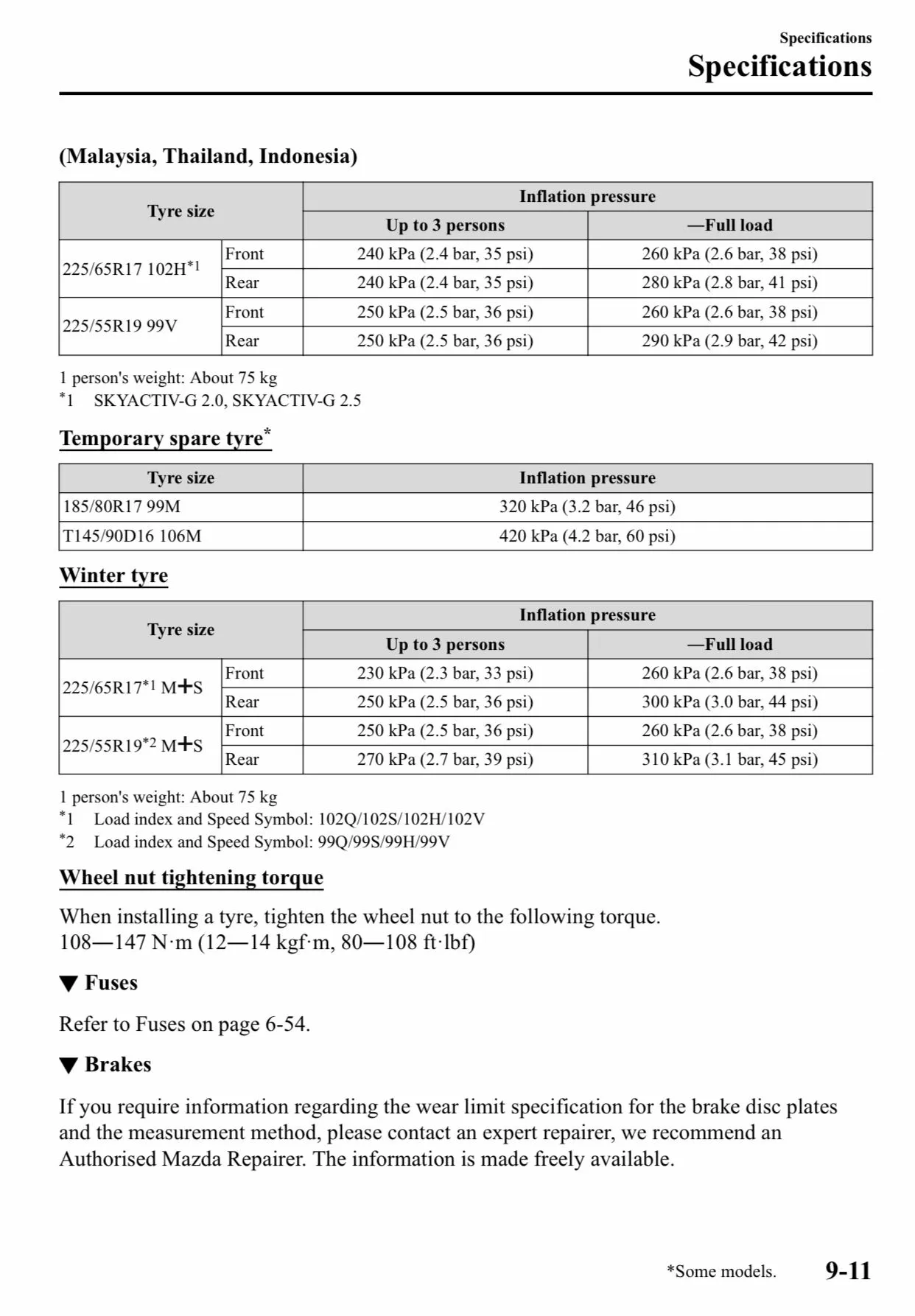 I go with 39 psi cold too for all four 19 tires mainly for even tread wear to maximize the tire life. My experience on one-number-fit-all manufacture recommended tire pressure for US market is its usually a bit too low which wears out the outer sides of tread faster. Tire pressure should be flexible depending on many variables: tire type、brand (design characteristic)、temperature、speed、and load. For those who believe we should follow Mazda recommended tire pressure with 35 psi (36 for gen-1 CX-5) on 19 tires, see the different tire pressure recommendations for CX-5 from UKs 2017 CX-5 Owners Manual with wide range from 36 to 42 psi depending on load. One example even recommends 45 psi on winter tires!