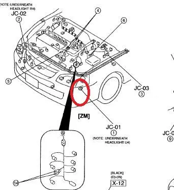 I recently purchased a 2002 Protege5. The headlights and turn signals/ hazards do not work. The brake lights and tail lights work. Just no headlights nor turn signals. The previous owner did a hack job installing HID headlights. While I was working on it I decided to take the front bumper off. After removing the bumper i saw the JC-01 box.(the ground box located below the driver headlight) all of the ground wires coming from that spot had been cut and were not hooked to anything. I think those ground wired being unhooked is what is causing my problem. I have looked over the wiring diagrams many times and am unable to find where these black ground wires go. If anyone would be able to help it would be greatly appreciated. Thanks