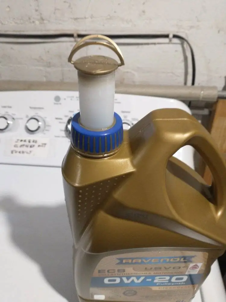 Oh wow, the 5-liter Ravenol Eco Synth ECS 0W-20 oil comes with a built-in spout! I hope it doesn’t have the foil seal on top and I really hate it since the oil companies started using it. This foil seal is hard to remove cleanly, and it may fall into the container or engine if you aren’t careful. People have been having such problem form time to time, and there’s nothing we can do about it if the pieces of foil been poured into the engine. Have been told by several mechanics that they found pieces of foil frequently when they open up the valve cover.