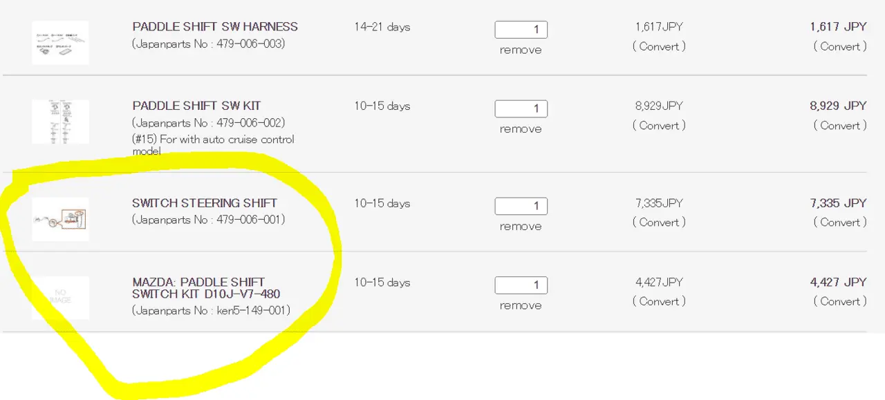 So I understand that this is the COMPLETE package you need for a 2016 GT with normal cruise control. I noticed that Japan parts added a NEW part (last on the list, JAPANPARTS MAZDA: PADDLE SHIFT SWITCH KIT D10J-V7-480 (D10J-V7-480) | JDM Japanparts.com |) that seems the be the excat same as the one just above (Mazda SWITCH STEERING SHIFT | JDM Japanparts.com | KEEAW/ KEEFW/ KE2AW/ KE2FW/ KE5AW/ KE5FW), but at HALF the price.... I asked them what the difference was....Correct, when you order from japanparts, select Option #15 on part No : 479-006-002, whether or not you have radar cruise or normal cruise control.