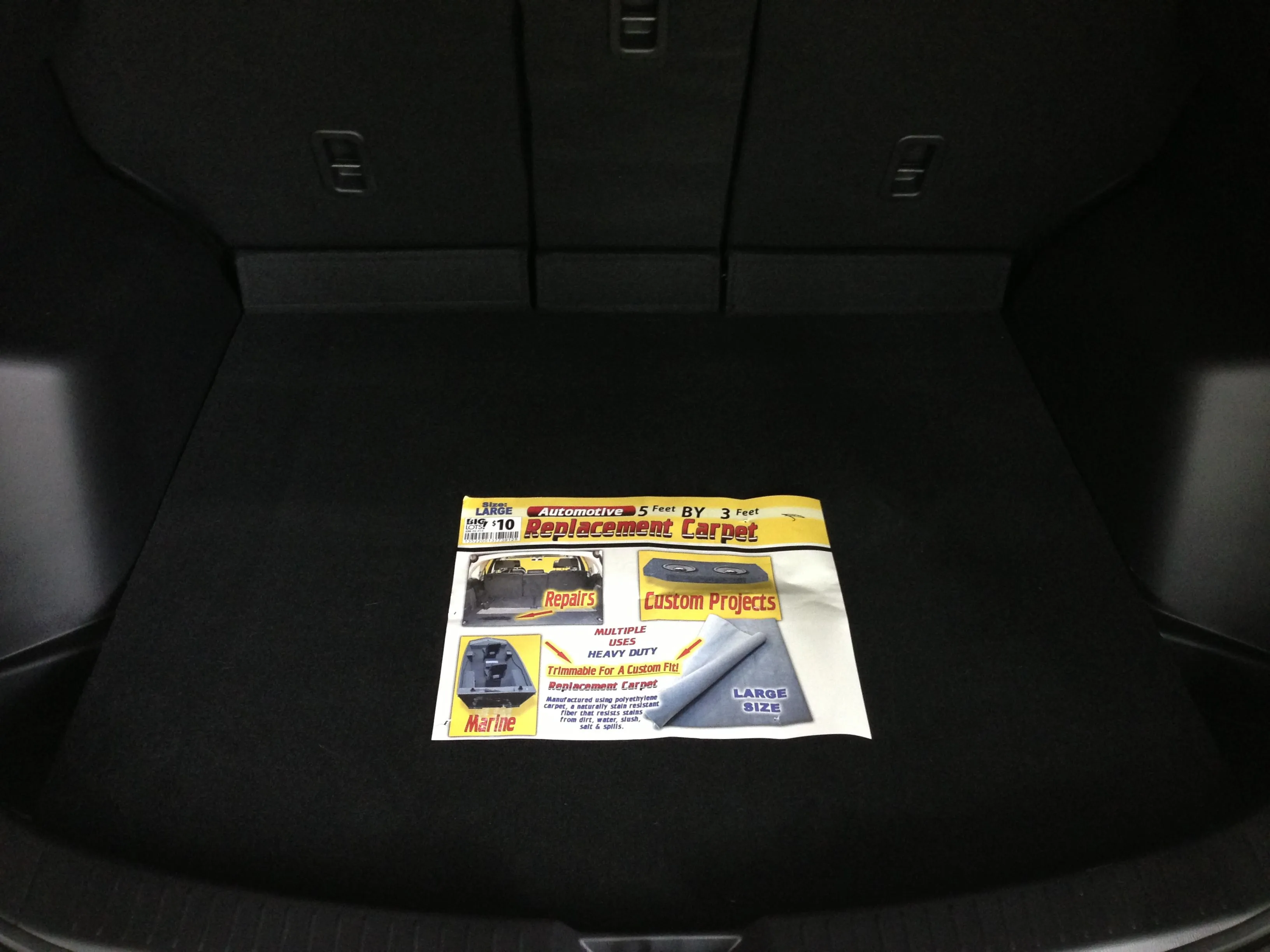 Hello everyone, I just wanted to post this little upgrade I did today. I am anal about something spilling or ruining the carpeted area inside the rear hatch. I have been trying to think of something not cheesy to do to protect the area, and yesterday I ran across a roll of carpet at my local Biglots store here that is exactly the same material and color as the black carpet inside our CX-5's. And with it being 3'x5' it is the perfect length front to back to fit. I just needed to trim the width to 41" and cut the rounded contour at the backside. Looks awesome for $10 and will protect the factory carpet. The picture attached is of the new Biglots carpet in place and the packaging that was around the roll.