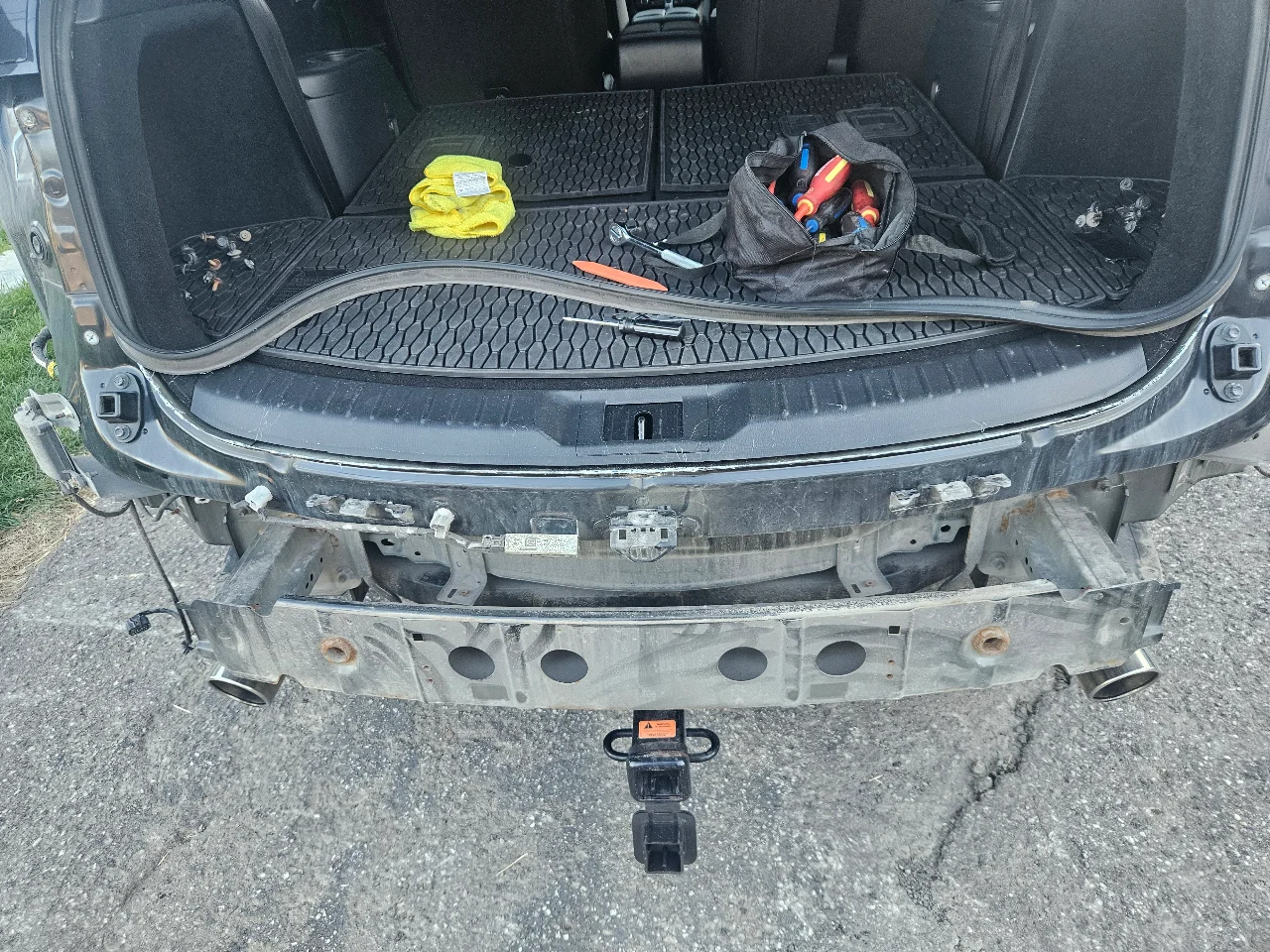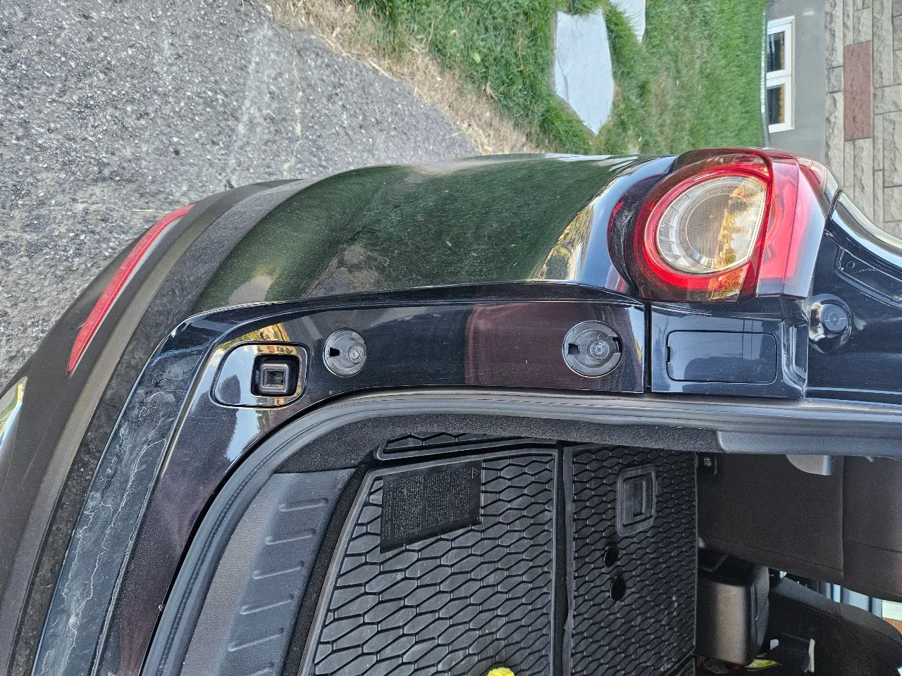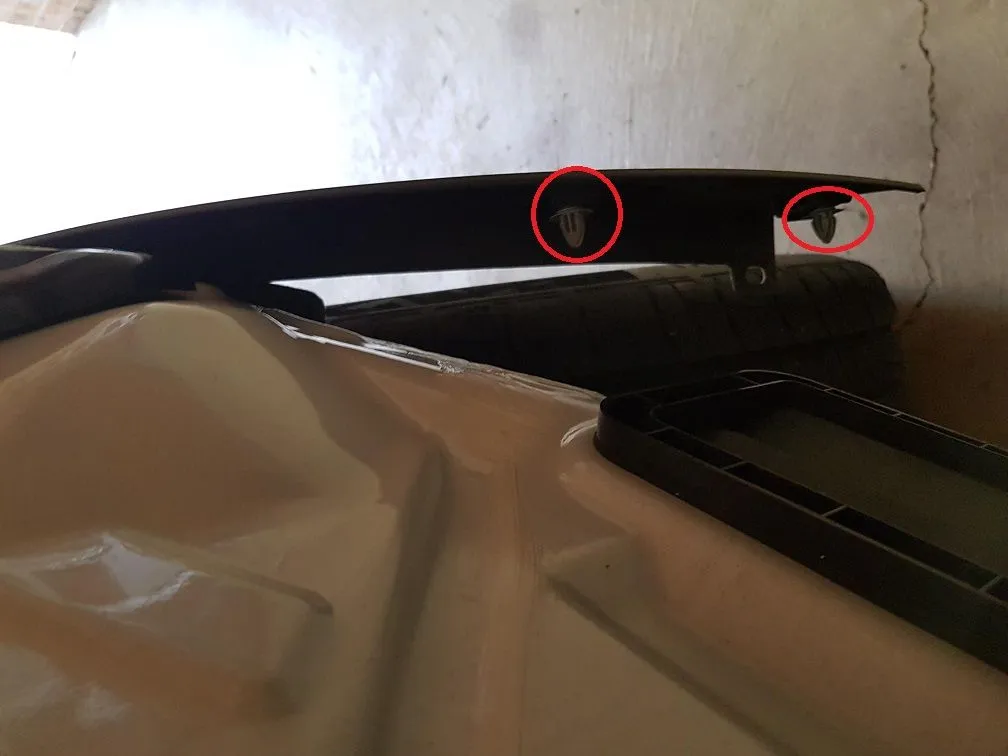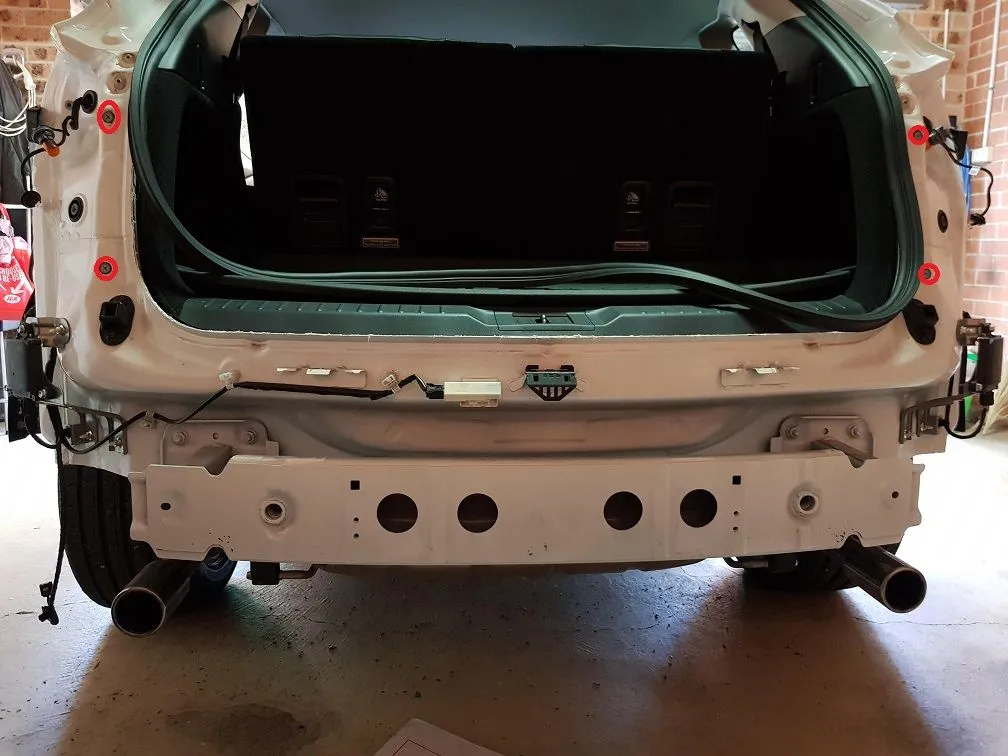 1. Open tailgate and remove the 2 x car coloured round caps from each side (near the rubber seal) - once removed unscrew the screws - 4 in total (circled in the image below). Note: i had removed the rear lights however i don''t think that they need to be removed?.