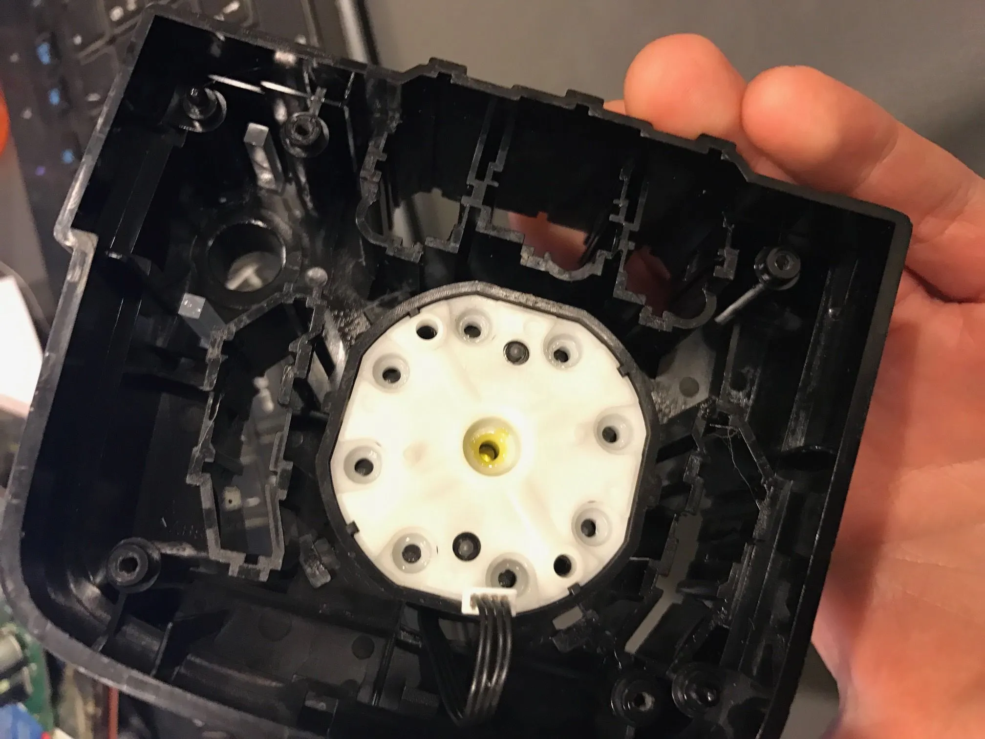 Long story short, I spilled pineapple juice all over my center console. I've followed plumber78's guide over at Mazda6Club to remove the center console and opened up the unit that houses the commander knob, volume pot, buttons and PCB. I've pulled out all the buttons for cleaning, but the cavity that holds the commander knob/switch in place is gunked up, and I can't figure out how to remove it for the life of me.