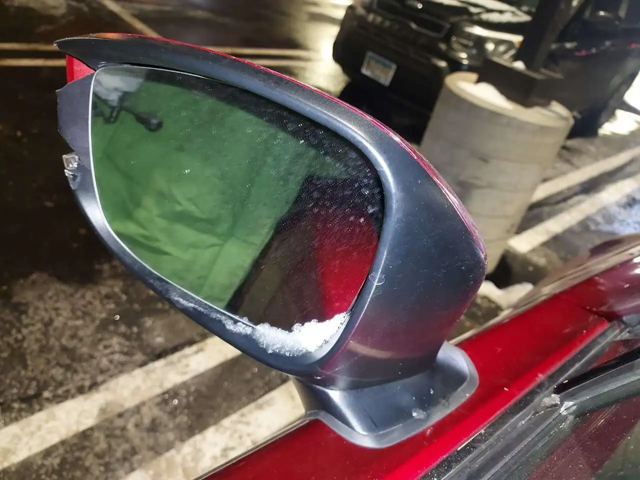 Someone door checked our CX-9's driver's side mirror in a parking lot. Fortunately the mirror is still functional after the black trim sacrificed itself for the greater good.