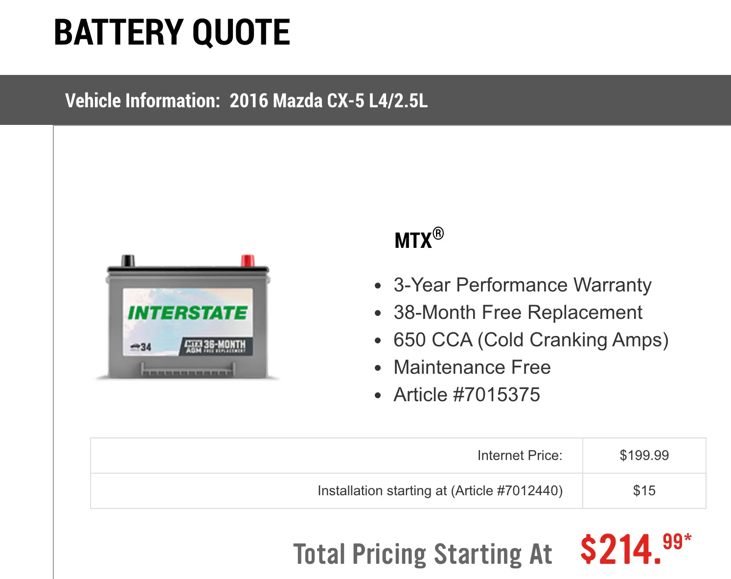 I checked WheelWorks and the replacement for a 2016 CX5 Group 35 battery is quoted at $199 with $15 for install (yay to Bay Area prices)