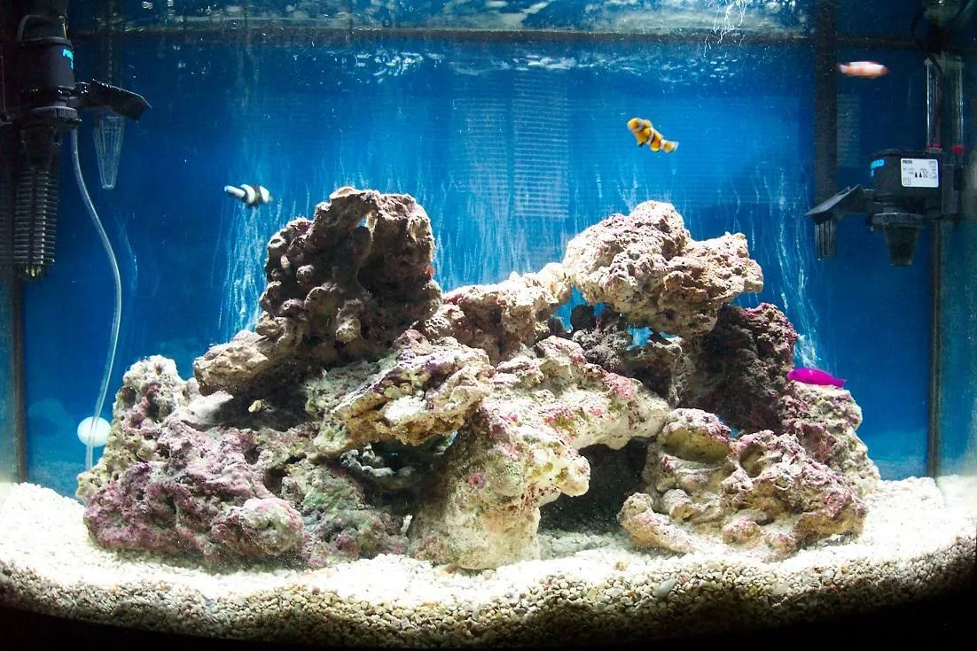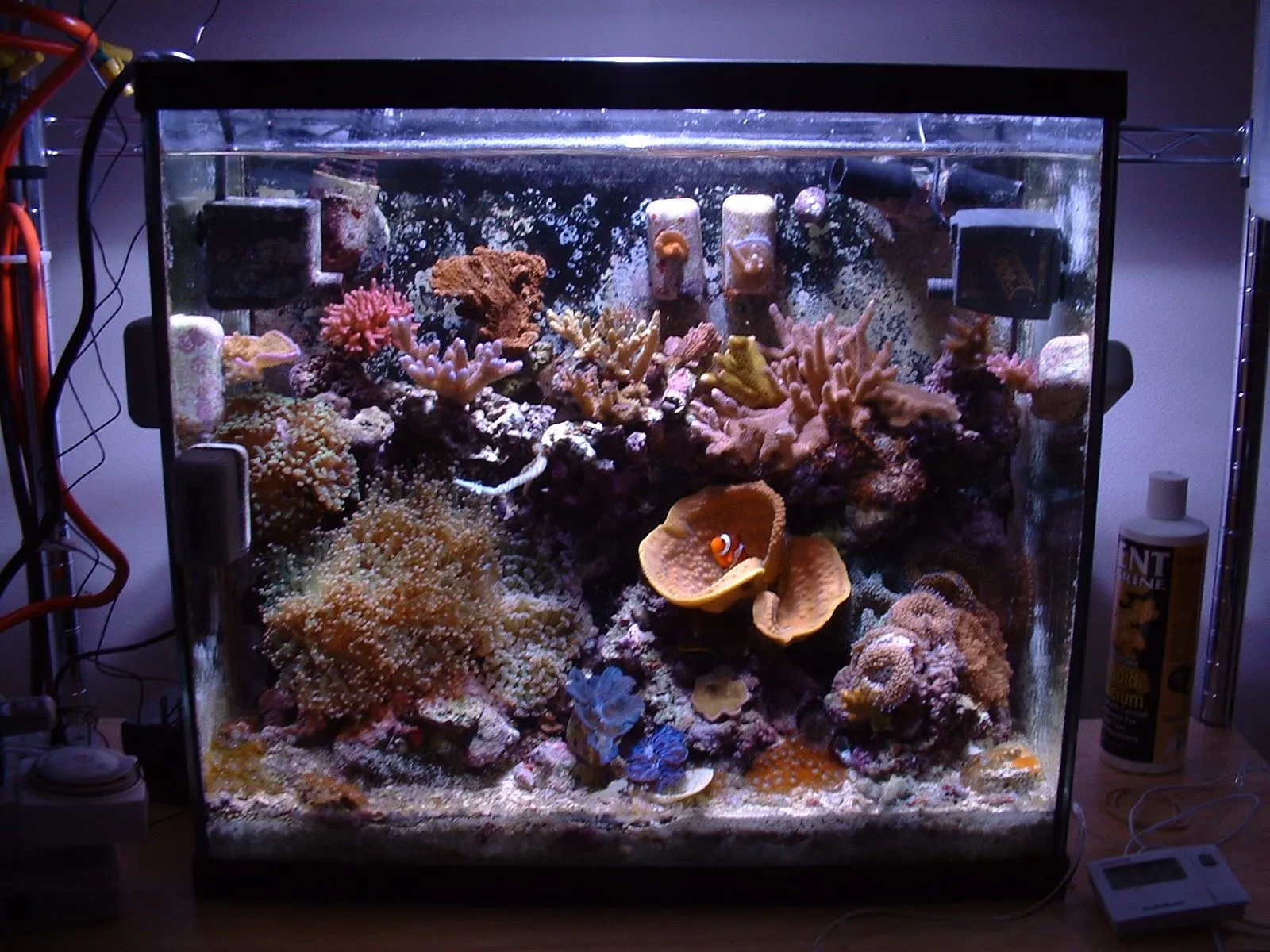 my wife set up her 36 gallon (bowfront) saltwater tank about 6 weeks ago. she eventually wants to establish a semi-reef system. currently there are 3 clownfish (2 percula, 1 ocellaris) and 6 lbs of live rock with crushed coral for substrate. flitration consists of a penguin 170 and an undergravel with two powerheads (201).