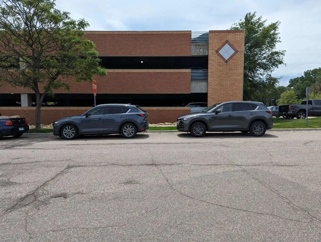 In the back is my Machine Gray Metallic on 19" wheels with 225/55 tires and 2" Corksport lowering springs.