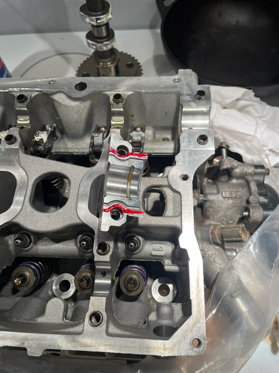 Next, I had an issue that was bugging me: the workshop manual says that when re-assembling the head, that you need to apply some Loctite "962T" on the cam journal #6 on the exhaust side. One problem, they don't make 962T anymore. After a lot of searching I found a published update on the NHTSA site that says Loctite 518 can be used instead. Link to Article