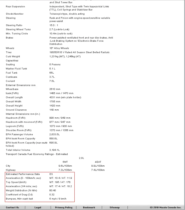 For what it's worth, Mazda Canada posts the 0-100km/h time as 10.4s for the 2003 Protege 5 manual transmission.