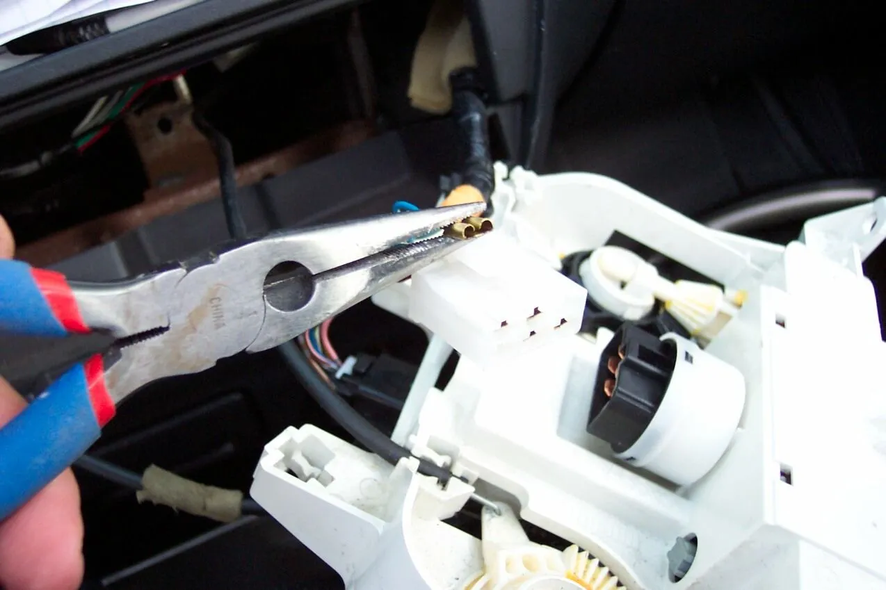 Before doing this, I noticed that if I would pull the wire harness out a couple of mm, I would lose electrical contact completely (obviously). But what surprised me was that when I would push the connector in SLOWLY to the point of just making electrical contact, only fan speeds 1 and 4 would work. I would have to push the connector in further to engage all fan speeds. After squeezing my contacts, I now have the A/C light completely solid during ALL fan speeds, EVEN when I pull the connector out a few mm. So this worked for me!