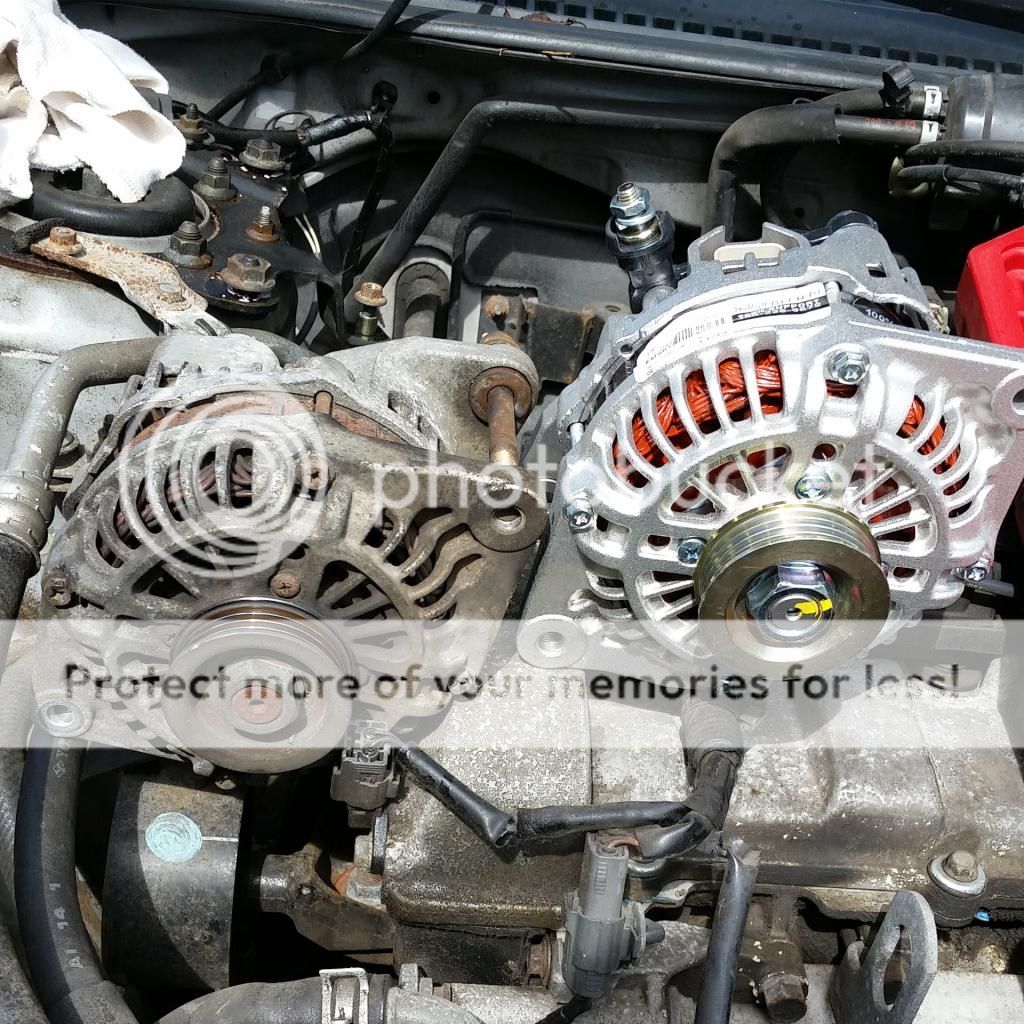 My latest endeavor was putting in a new alternator yesterday morning.  I was heading out of town Friday night, for the weekend, to visit some family and I got about 30 miles from my house when all of my lights dimmed and the ABS light came on... no battery light.  Earlier on Friday we had some nasty storms roll through and left some lakes on the roads.  I hit a big one and developed a bad whine from the alternator.  After I got home and let her "dry out" for a bit, I got in the car and headed out.  Right before all of my lights dimmed, I smelled something funny and got nervous.  Sure enough, the alternator fried.  I somehow managed to make it back home on my battery alone.  As it turns out, our cars can go into a sort of "limp mode" and cuts back to the bare minimum electronics.  My radio cut out, my cigarette lighter went out and stopped charging my phone and my transmission computer stopped working and wouldn't allow the trans to shift anymore.  I checked my voltage right after the alt went out and it was at about 10.5V.  When I got home it was down to 7V.  Lucky for me, Autozone was still open for another hour and actually had my alternator and both belts in stock!