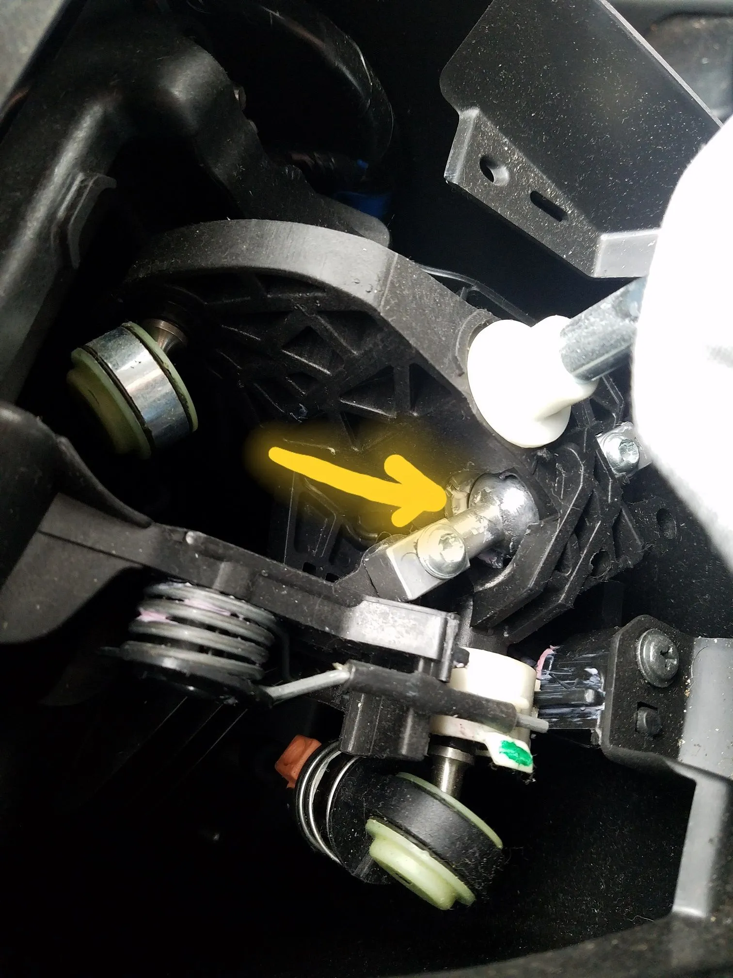 My shifter (Mazda 5, 2007, manual transmission) started making a crunching noise and became fairly loose -- it still shifts ok, but clearly something isn't right. I opened the shifter housing and found what looks like a ring/bushing surrounding a metal sphere/rod. It seems like the purpose of this part is to keep everything in alignment, but the part is pretty much destroyed. It looks like a $1 or $2 part, but I have no idea what it's called to try to find a replacement. Anyone know what the part is called from the pics, or and have a suggestion where to find a replacement?