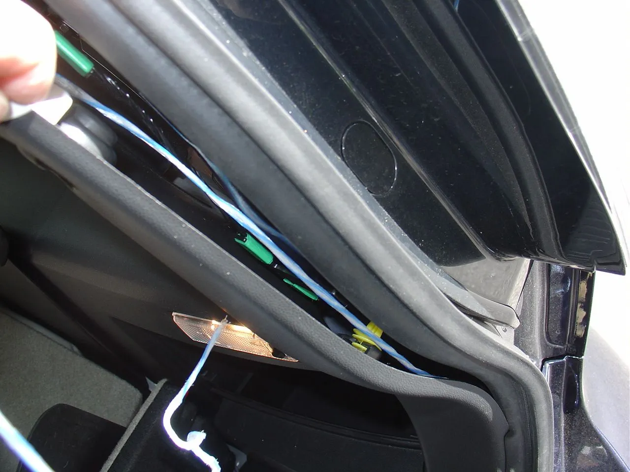 Now comes the hardest part of the install, fishing the wire from the top of the hatch, around the window and into the bottom half. I thought I was going to be here for days doing this but it turned out to be so simple in the end. First off remove the little rectangle plug on the side of the rear window, in here you will see the wire for the defroster grid. If the factory got the wire through, so can you! I bent my fishing wire to about the path I wanted it to follow, this helps it go where you want it to. Then I fished it into the hole where the boot was and just slowly pushed it in, jiggling if it hit any obstacles. Surprisingly it went pretty easy but I could not locate it even though it was where it should be. The thing here is that when you look into the rectangle hole, you can see some body structure, and even though you would expect it to wind up on top where you can see it, it comes out under the channel, not over it. You will need to fish through a fairly narrow opening to get to the void under the glass (with the hatch up) but its very possible. Picture 3 shows the exit point. At this point you can crack a brew and enjoy being past the halfway point.