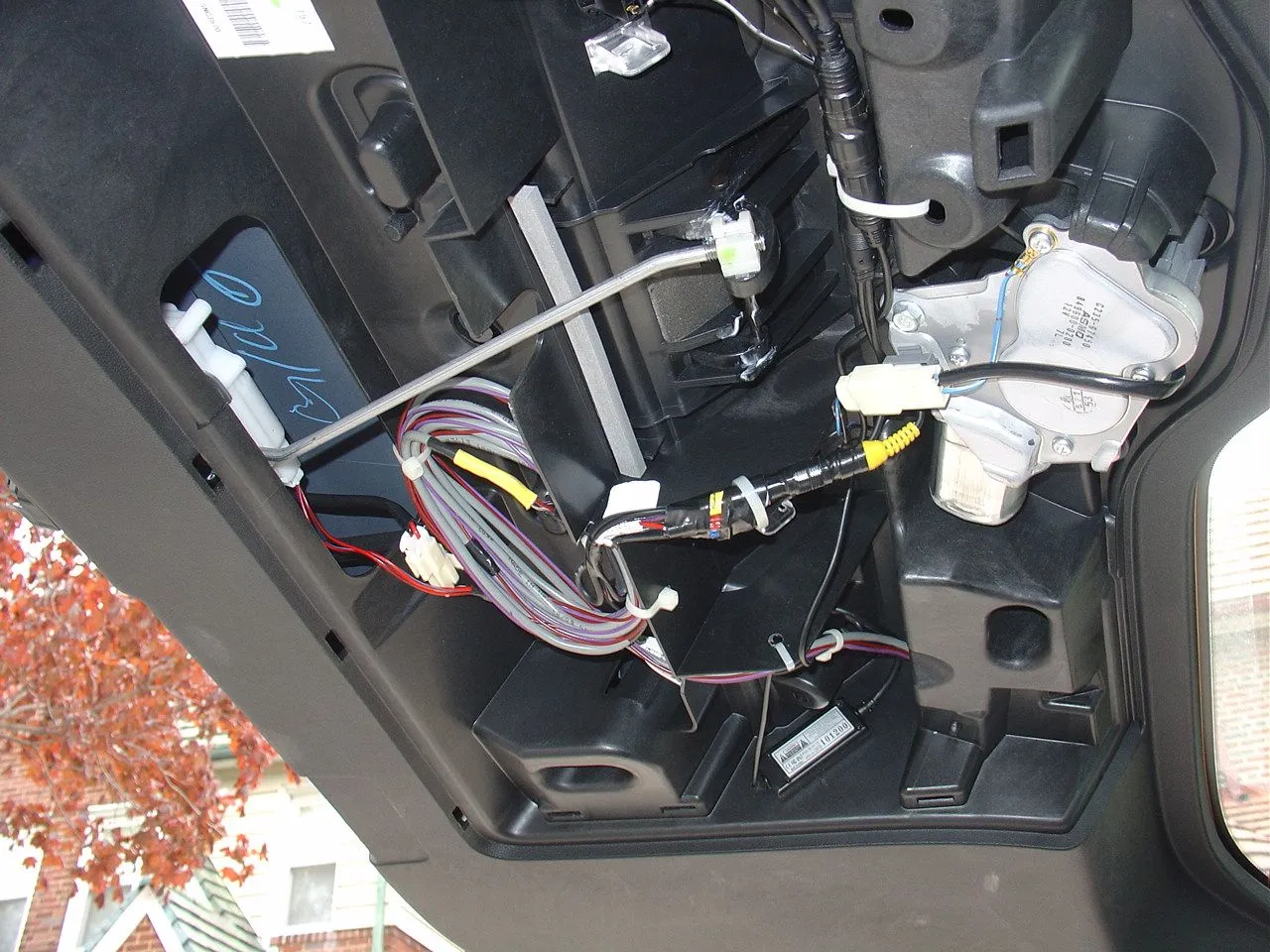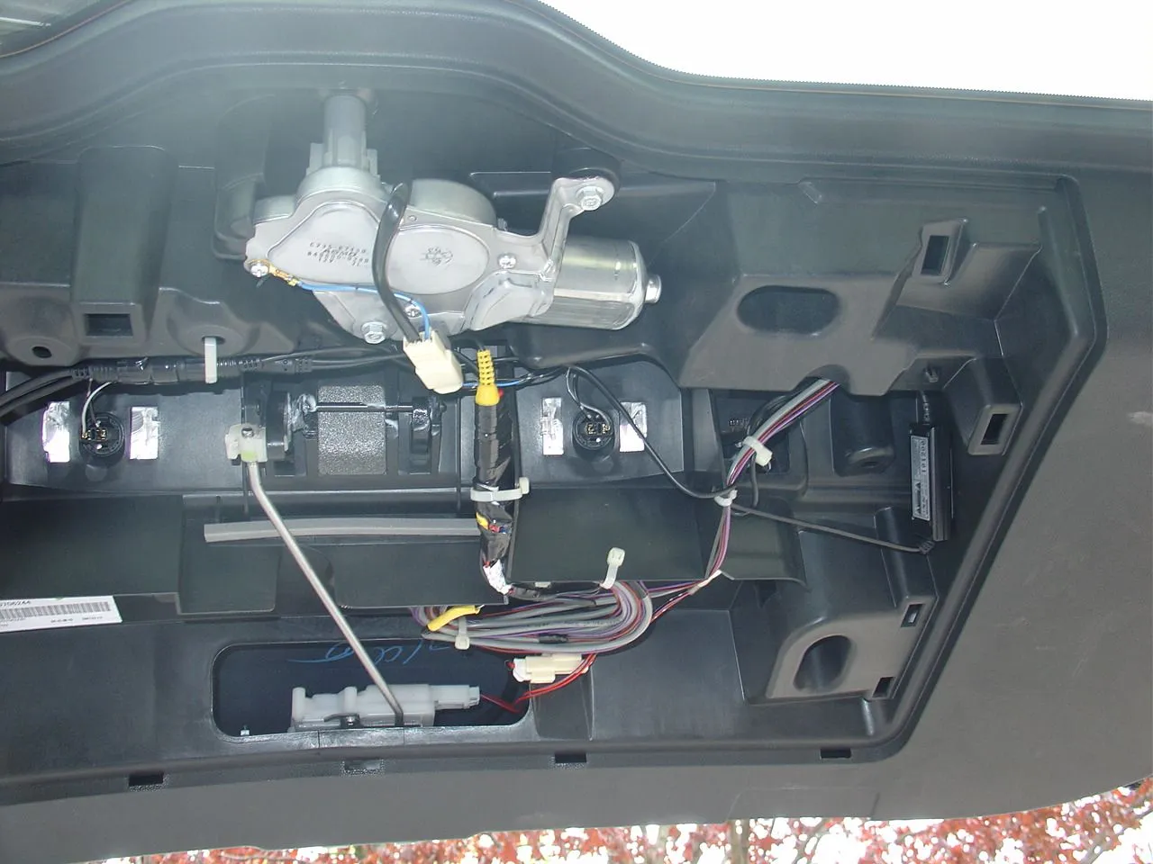 Wiring through the hatch to the camera area. Now you will need to remove the trim panel on the inside of the hatch. Hmmm Maybe this was the hardest part of the install. The trim panel did NOT want to move, I thought I was going to break it for sure but it did go, stubborn thing had me cursing! I used my putty knife to pry off the top by the wiper and it did not go easily at all. I was able to get enough room to get my fingers in on one side and just pulled as hard as I could over as wide an area as I could manage. I thought it broke when it finally let go but it turned out to be in one piece and totally unharmed. Whew! Now that it was off there was a very convenient hole that youwill see in the pictures to fish the cable into the bottom part of the hatch. Once you have the wire down there, you can pretty much close up all the trim panels you took apart in the previous steps.