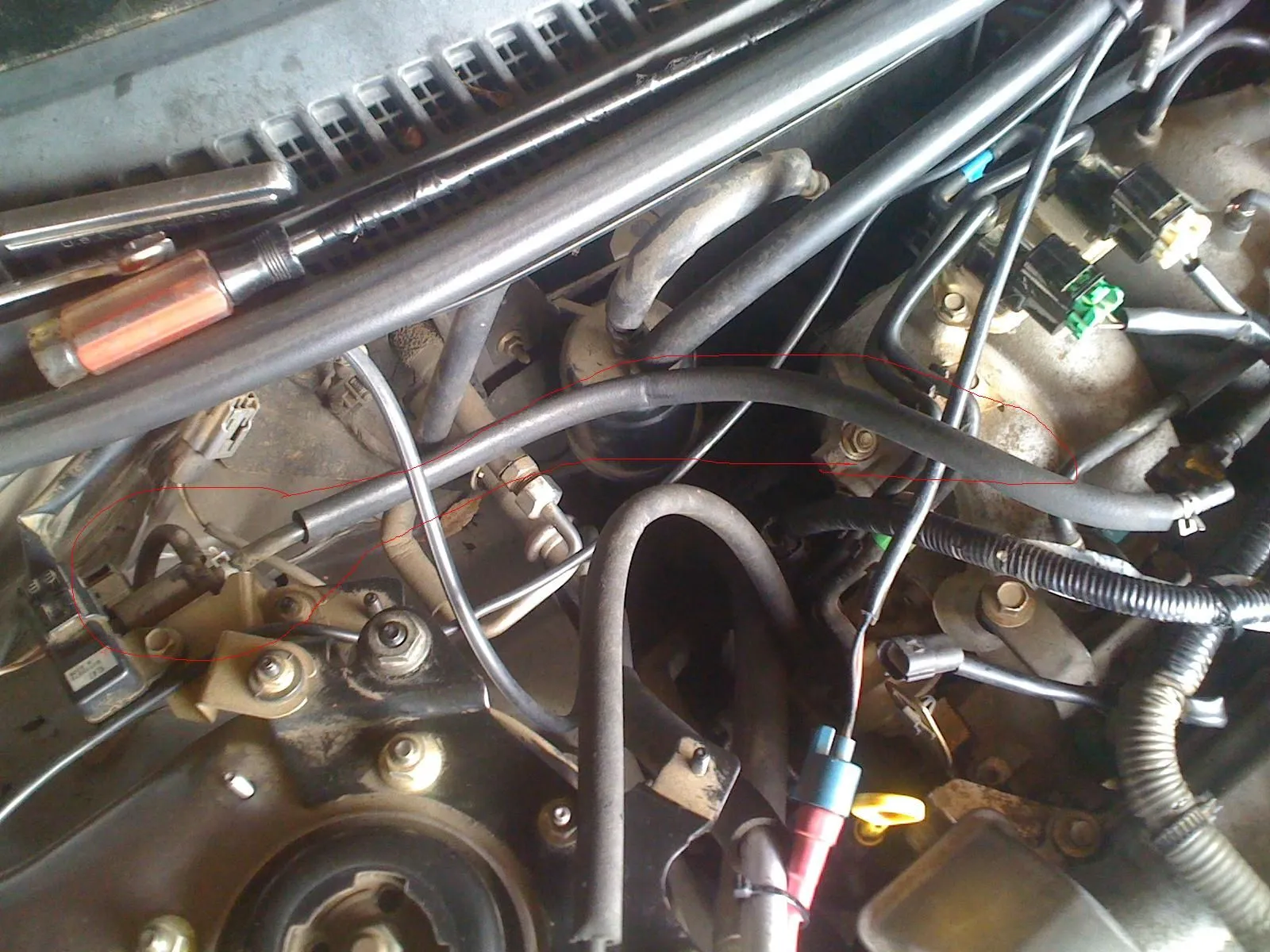 Vacuum diagram is on the underside of the hood. Pic 4 hose goes to the intake mani, the hose in pic 3 goes to the front port on the little black canister on the passenger side of the firewall. The hose that is in the canister may be from the brake booster and that should go on a port on the back of the intake mani in the center. The connector that bolts to the cold pipe by the throttle body is mounted upside down.