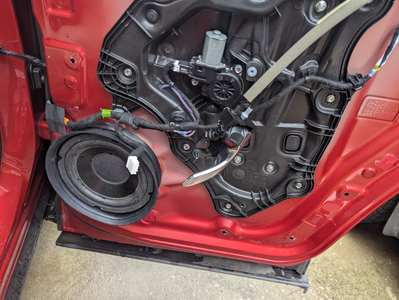 Front door speakers I went with Linear Power LP8.0's. These speakers are nothing short of incredible. Absolutely mind boggling. They are so damned good, you absolutely, DO NOT NEED any type of subwoofer at all. Yeah, they're just that good. I can't give these speakers enough praise. Buy them. I mounted them with the factory Bose door adapters, part number KD45-66-A61. They are made for the Bose 9's, so they are slightly too big for 8's. I simply made an adapter plate out of 1/8th inch aluminum to go from the speaker to the factory bracket. I used the factory speaker wiring. Done and done.