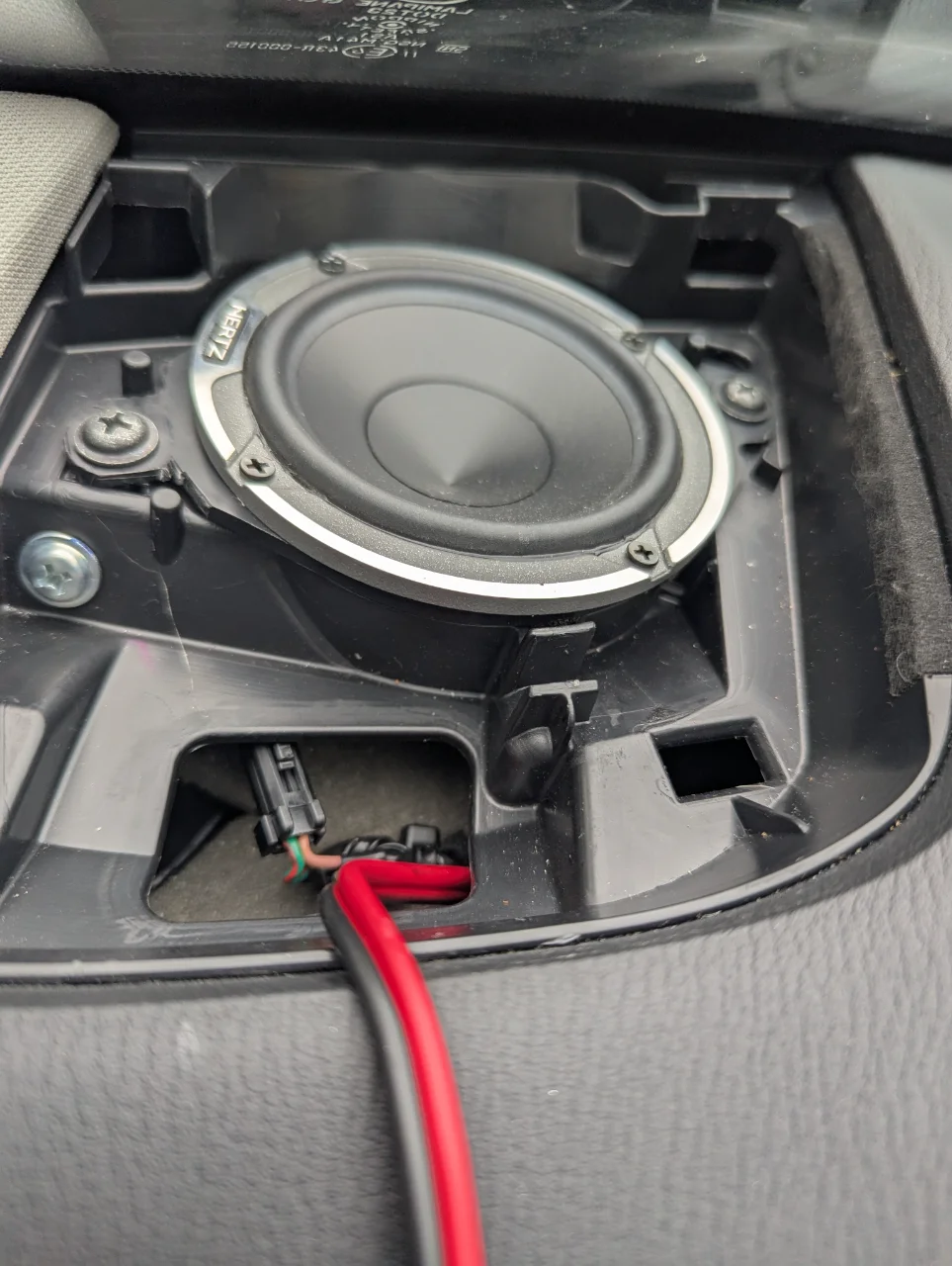 For the dash speakers, I went with JL Audio C2-350X's, as they fit perfectly in the factory openings. I also went with the JL Audio C2-075ct tweeters. I found a set of Bose dash grilles on eBay, ordered them up, and used hot glue to mount the tweeters in the factory locations on the grilles themselves. Pretty easy! To wire them, I dropped two runs of speaker wires straight down through the dash, and then over to the door sills, then to the amp. The reason I had to run new speaker wire is each speaker in the car is driven off of a seperate amplifier channel.