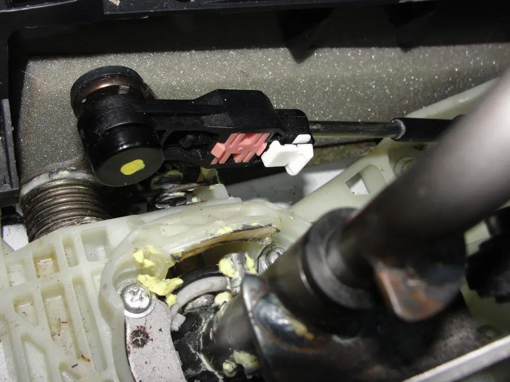 After you pull that white clip to the side, the pink plastic clip needs to push outword out of the black housing towards the shifter.