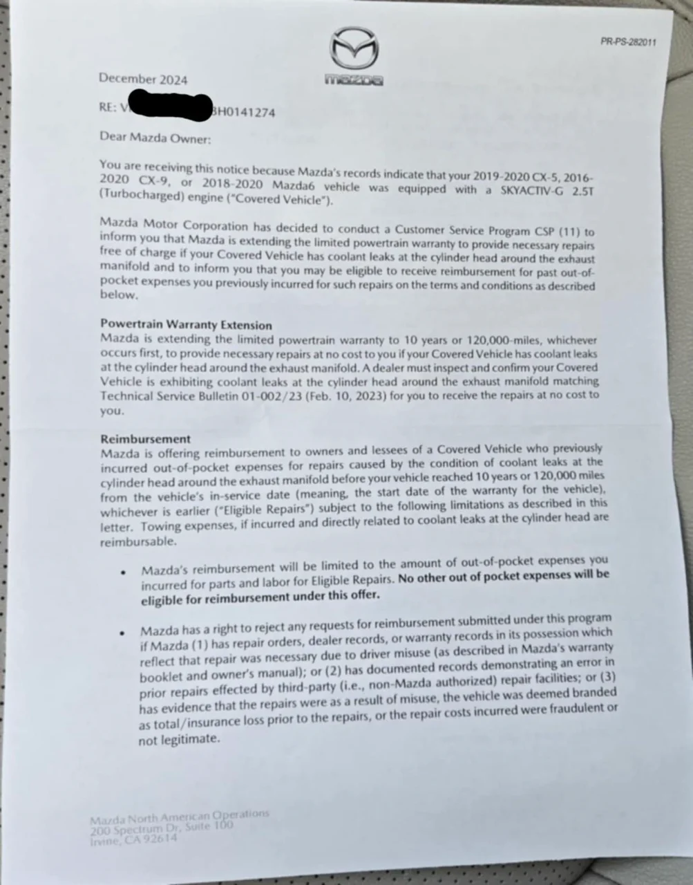 I feel the same way even though mine has not had this issue as of yet.Just coming here to let everyone know...We had to have our engine replaced in Sep of '22 due to this defect. After fighting with our local dealership we had to pay $2100 out of pocket for the repair back then. Received the CSP letter from Mazda in late December, applied for re-imbursement on Jan 1st, and was notified yesterday that Mazda has approved our claim and would be receiving payment in 10-14 days! Good on Mazda for FINALLY making this right.