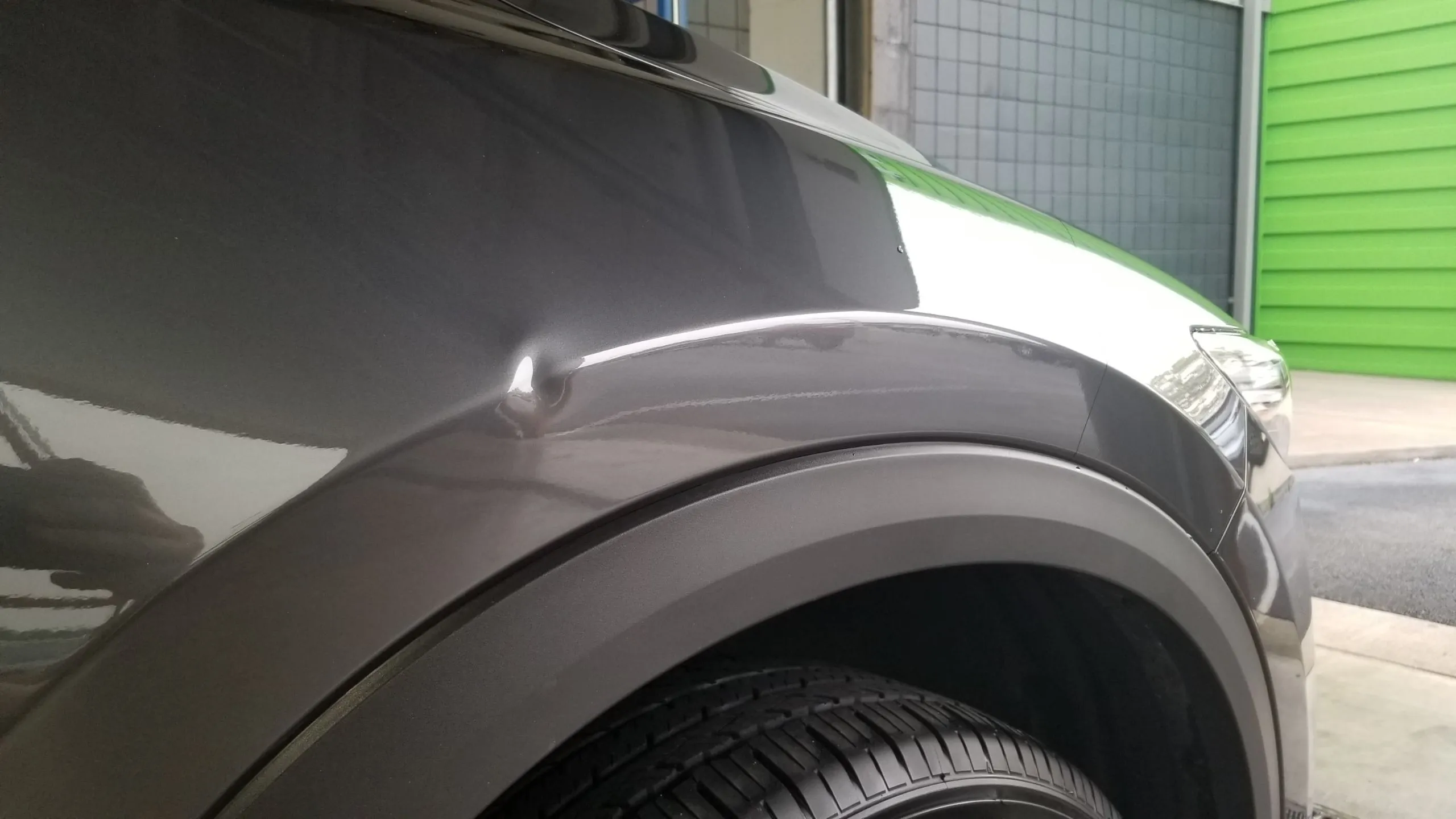 Well, I now officially hate "Machine Gray, Mazda 46G". Multiple body shops in my area with 1/4 million dollar paint booths absolutely refused to work on my car, or if they did, said they would blend 2 panels either side of the work, and not guarantee results (basically instant 4-figure job for a quarter sized spot...). 46G is impossible to properly paint match from all angles, apparently, so find you a donor car to pull panels off of I guess. The PDR guy (apparently the shop I originally went to called in a guy with tons of experience) fixed my dent pretty darn well, to the point I'm only mildly irritated, now, but damn, if my car gets truly bent up, it's totaled pretty much is the gist.