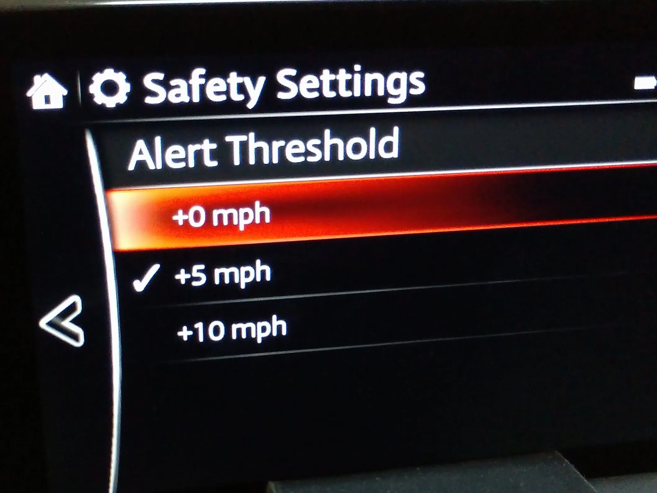 The heads up display has a setting that flashes at 10mph over - i have that on. It shows an amber ring around speed limit when 5 over. I ignore the amber ring, but the flashing border is a good reminder if i am 10 over.
