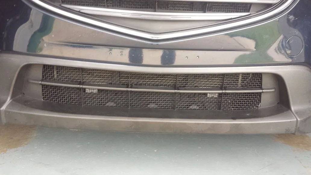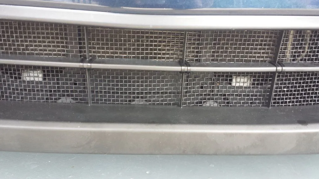 Stainless mesh painted black. Bottom piece is 28.5" X 6.25" and the upper piece is 32" X 8.5". Zip ties on main bottom bar, with a dab of silicon on the corners. I didn't attach on the verticals because I thought they were too thin. It should be enough to at least deflect a radiator-killing blow. Upper section is attached under the crossbar only.